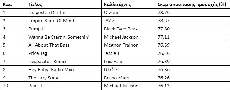 Στην κορυφή της λίστας βρέθηκε το θρυλικό “Dragostea Din Tei” των O-Zone, με δείκτη απόσπασης 78,76%. Ο υψηλός ρυθμός (130 BPM), η έντονη ενέργεια (97) και η υψηλή χορευτικότητα (81) φαίνεται να ωθούν τους οδηγούς να κινούνται με το σώμα ή να χτυπούν ρυθμικά το τιμόνι. Το αποτέλεσμα; Μια εμπειρία μεν διασκεδαστική, αλλά όχι πάντα ασφαλής.