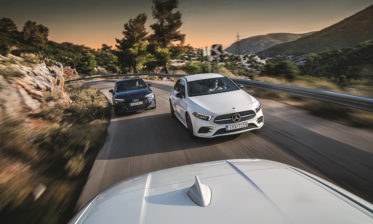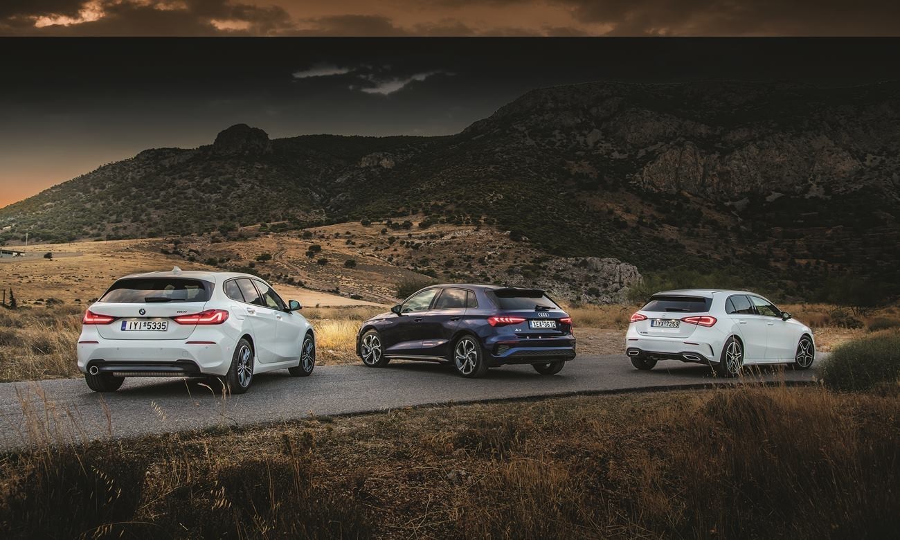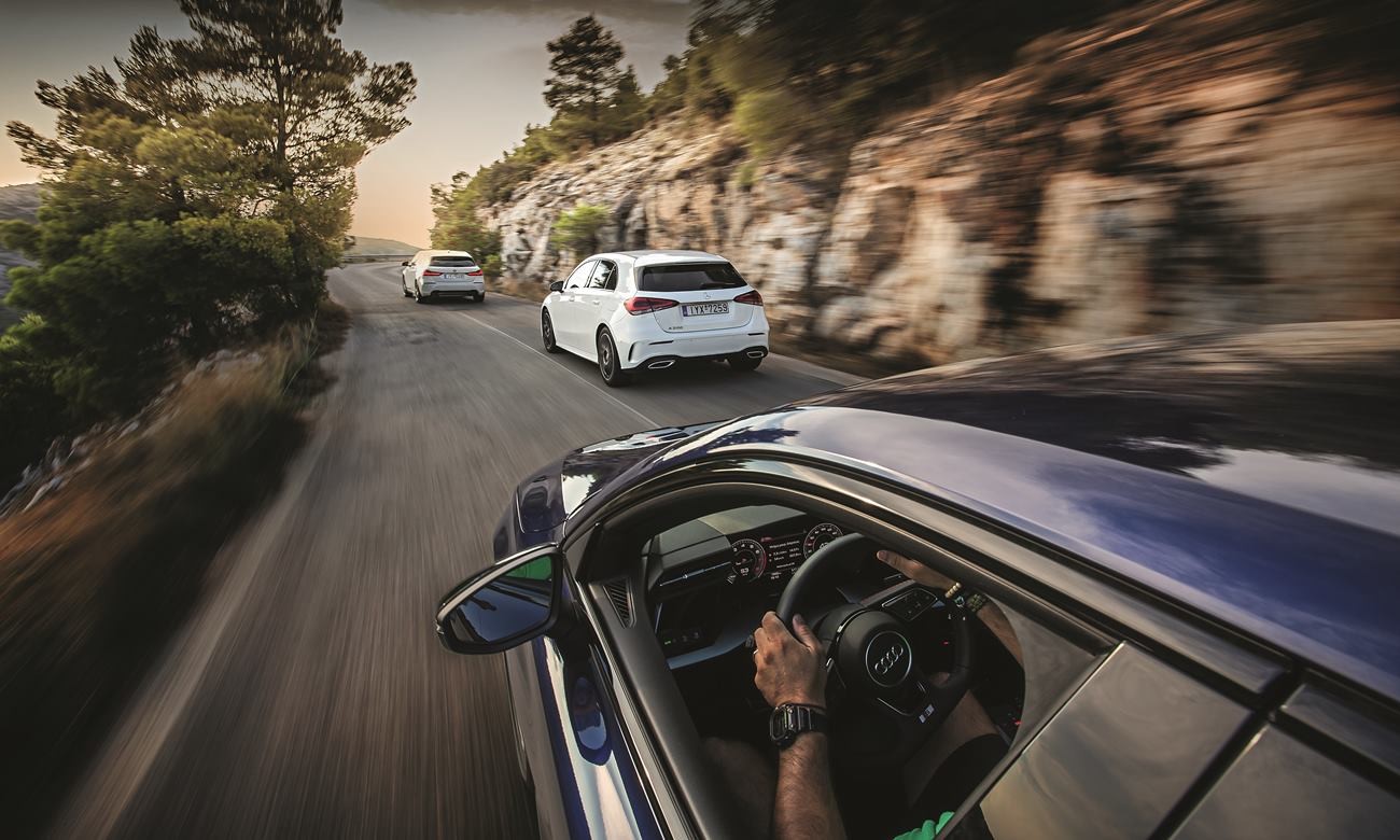 Και τα τρία αυτοκίνητα που δοκιμάζουμε διαθέτουν, θεωρώ, την πιο ταιριαστή έκδοση από την γκάμα των κινητήρων τους. Ολοι βενζινοκινητήρες, όλοι τούρμπο φυσικά, και κανείς πάνω από το 1,5 lt. Επίσης, και τα τρία είναι αυτόματα με κιβώτια διπλού συμπλέκτη επτά σχέσεων, κάτι που συμβάλλει και στο premium πρόσημο και στην ευκολία χρήσης. Ο κινητήρας του A3 είναι ο γνωστός και μη εξαιρετέος 4κύλινδρος 1.5 TFSI με το σύστημα απενεργοποίησης κυλίνδρων COD και απόδοση 150 PS και 25,5 kgm ροπής. H έκδοση που είχαμε στα χέρια μας διέθετε και 48 volt ήπιο υβριδικό σύστημα με μπαταρία ιόντων λιθίου που συνδέεται με μια γεννήτρια-μίζα, η οποία μπορεί να ανακτά ενέργεια τροφοδοτώντας την μπαταρία με ισχύ έως και 12 kW. Kατά την επιτάχυνση υποβοηθά τον κινητήρα με έως και 14 PS και 5,1 kgm ροπής.