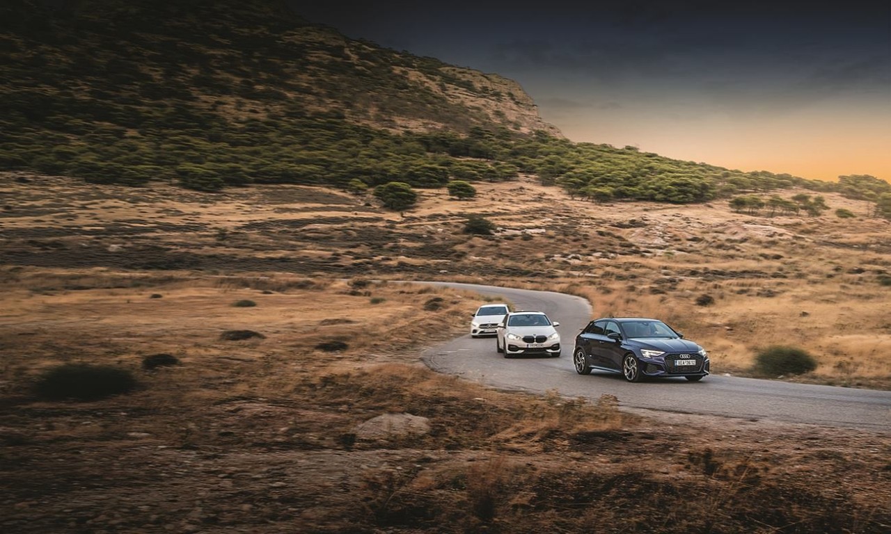 Και τα τρία αυτοκίνητα που δοκιμάζουμε διαθέτουν, θεωρώ, την πιο ταιριαστή έκδοση από την γκάμα των κινητήρων τους. Ολοι βενζινοκινητήρες, όλοι τούρμπο φυσικά, και κανείς πάνω από το 1,5 lt. Επίσης, και τα τρία είναι αυτόματα με κιβώτια διπλού συμπλέκτη επτά σχέσεων, κάτι που συμβάλλει και στο premium πρόσημο και στην ευκολία χρήσης. Ο κινητήρας του A3 είναι ο γνωστός και μη εξαιρετέος 4κύλινδρος 1.5 TFSI με το σύστημα απενεργοποίησης κυλίνδρων COD και απόδοση 150 PS και 25,5 kgm ροπής. H έκδοση που είχαμε στα χέρια μας διέθετε και 48 volt ήπιο υβριδικό σύστημα με μπαταρία ιόντων λιθίου που συνδέεται με μια γεννήτρια-μίζα, η οποία μπορεί να ανακτά ενέργεια τροφοδοτώντας την μπαταρία με ισχύ έως και 12 kW. Kατά την επιτάχυνση υποβοηθά τον κινητήρα με έως και 14 PS και 5,1 kgm ροπής.