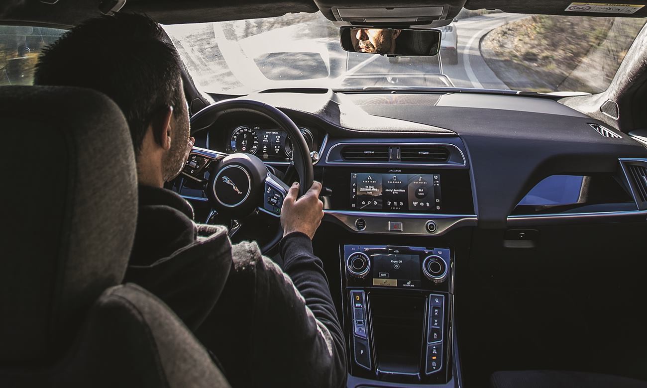 Η ουσία είναι ότι στην I-Pace νιώθεις περισσότερη ζεστασιά χωμένος μέσα σε ένα κόκπιτ με σαφή οδηγοκεντρικό προσανατολισμό, στο οποίο κυριαρχεί ο συνδυασμός σκουρόχρωμου δέρματος και αλκαντάρα με τη συνοδεία μαύρων γυαλιστερών επιφανειών και άψογα φινιρισμένου αλουμινίου.