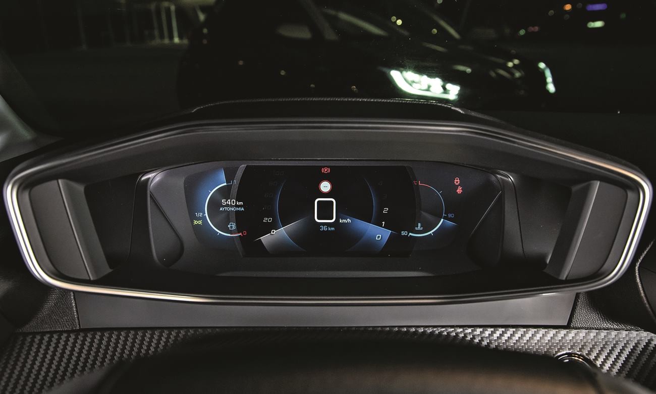 Μπροστά του βρίσκεται ο εντυπωσιακός (ψηφιακός εδώ) πίνακας οργάνων και λίγο πιο δεξιά, στραμμένη προς αυτόν, η κεντρική οθόνη του συστήματος infotainment, μέσω της οποίας προβάλλονται και ελέγχονται αρκετές λειτουργίες του αυτοκινήτου. Το πάνελ των αεροπορικού τύπου διακοπτών ακριβώς κάτω από τους αεραγωγούς, στο κέντρο της κονσόλας, σου υπενθυμίζει πως η Peugeot δεν είναι πλέον η ίδια.