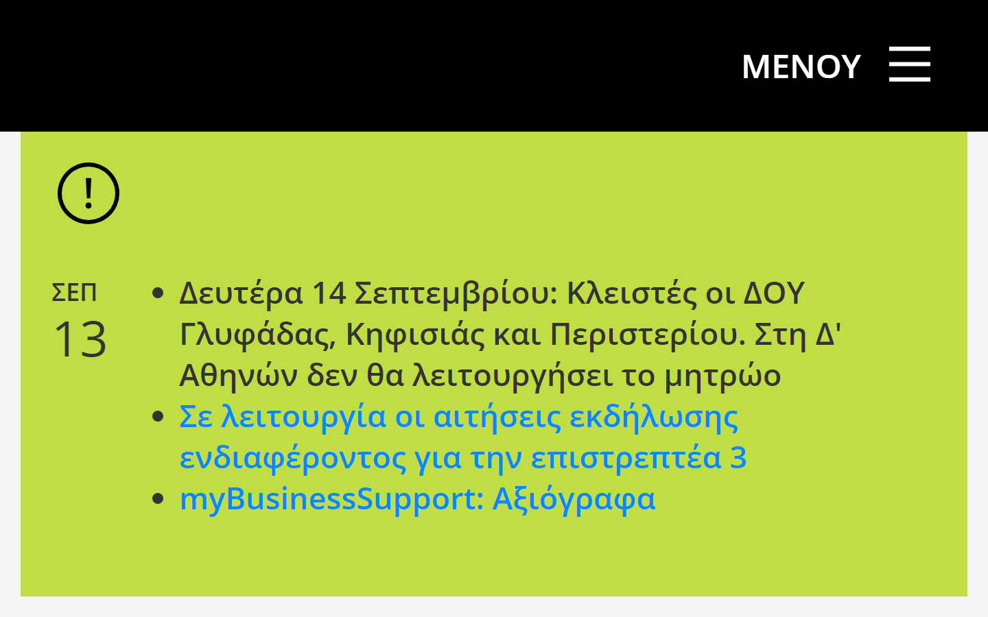 Και σήμερα όμως αναρτήθηκε νέα ενημέρωση για αύριο, Τρίτη 15 Σεπτεμβρίου, στην οποία και πάλι χωρίς να παρέχονται διευκρινίσεις επαναλαμβάνεται ότι δεν θα εξυπηρετούν το κοινό οι ΔΟΥ Γλυφάδας, Κηφισιάς και Περιστερίου, ενώ στη Δ’ Αθηνών δεν θα λειτουργήσει το μητρώο.