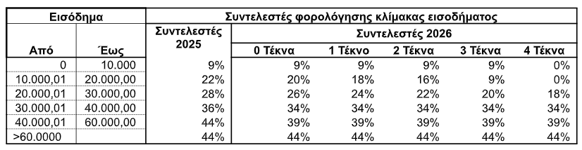 Με τα νέα δεδομένα, οι νέοι συντελεστές φορολογίας εισοδήματος που θα ισχύουν από 01/01/2026 διαμορφώνονται ως εξής: