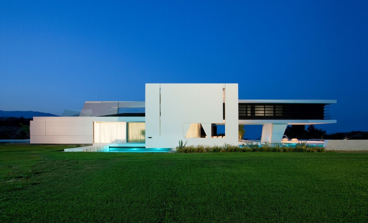 Ετσι και στο H3, ο καταξιωμένος σήμερα αρχιτέκτονας, δημιούργησε ένα μακρύ “όγκο” στον πρώτο όροφο ο οποίος είναι τα καθιστικά και το “αντίβαρο” ήταν το σαλόνι που ήταν το καθιστικό στο ισόγειο. Ο μεγάλος όγκος πατάει σε δύο κολόνες λοξές οι οποίες μπορεί να μην βρίσκονται μέσα στη θάλασσα, αλλά σε μια λίμνη που περιβάλλει το κτίριο και στο μπροστά της κομμάτι γίνεται πισίνα. Η έμπνευση προήλθε και από την αγάπη του ιδιοκτήτη για τη θάλασσα και τα γιοτ. “Θα μπορούσε να θυμίσει ως κτίριο και ένα σκάφος που κινείται στο νερό”, όπως λέει ο ίδιος. Το σίγουρο είναι ότι πρόκειται για ένα έργο μοντέρνας αρχιτεκτονικής που έχει επηρεαστεί από τα projects του Oscar Niemeyer με πολλές μίνιμαλ και δυναμικές φόρμες.
