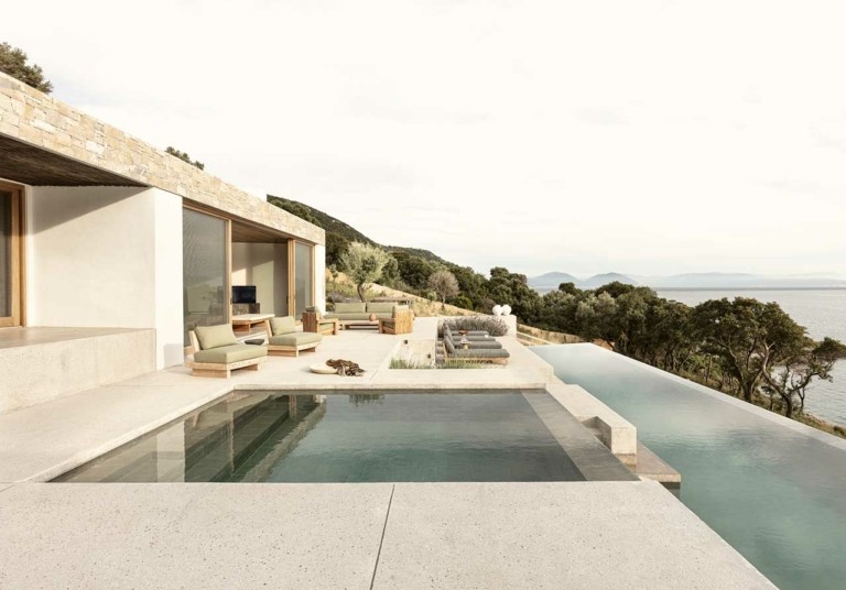 Για να μην “επιβληθεί” οπτικά στο τοπίο, το γραφείο Block722 έχτισε μέρος του σπιτιού μέσα στο έδαφος, επιτρέποντας στην αρχιτεκτονική να έχει κλίση προς τα κάτω, ενώ είναι σχεδόν αόρατο από το δρόμο, προσανατολισμένο προς το νερό και προσφέροντας θέα από κάθε δωμάτιο. Κατά την είσοδο από την μπροστινή πόρτα, οι αδιάλειπτες οπτικές γραμμές στρέφουν τα μάτια απευθείας στη θάλασσα. Η κύρια κατοικία περιλαμβάνει έναν μεγάλο ενιαίο χώρο καθιστικού, που πλαισιώνεται από μια κύρια σουίτα και δύο ακόμη υπνοδωμάτια. Κάθε χώρος είναι προσανατολισμένος προς τη θέα, έχει φυσικό φως και πρόσβαση στον εξωτερικό χώρο, χαρακτηριστικό της μεσογειακής αρχιτεκτονικής.