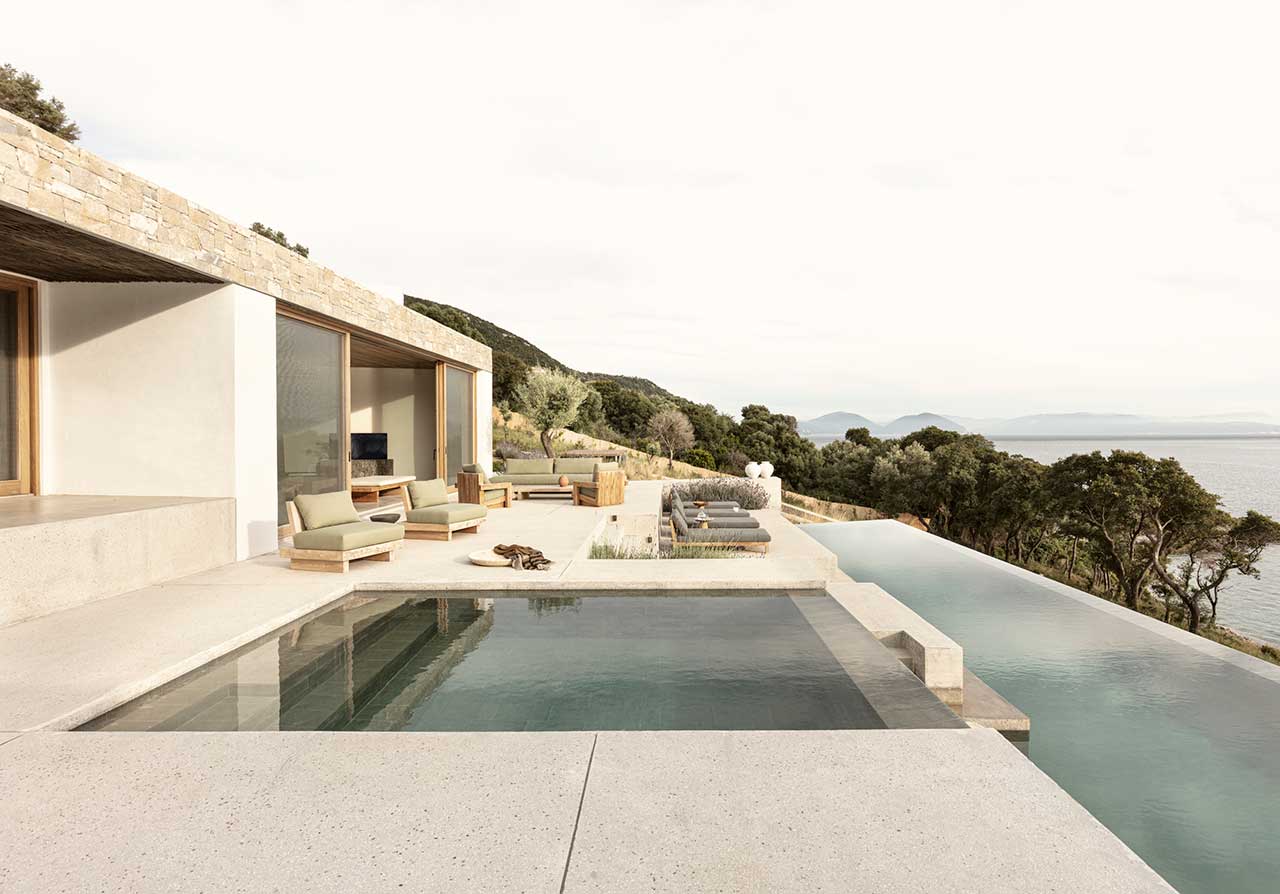 Τα φυσικά υλικά, τόσο στην κύρια κατοικία όσο και στους ξενώνες, συμπληρώνουν τη γύψινη κατασκευή από σκυρόδεμα και παραπέμπουν στην άγρια μεσογειακή βλάστηση γύρω από την περιοχή. Όλα τα δωμάτια διαθέτουν ξύλινο πλαίσιο iroko, τζάμια από το δάπεδο μέχρι την οροφή με το καθιστικό να περιλαμβάνει ανοίγματα τόσο στην πίσω όσο και στην μπροστινή όψη. Τα δάπεδα είναι είτε από φυσική πέτρα είτε από terrazzo που κατασκευάζονται τοπικά από εξειδικευμένο τεχνίτη. Μια σύγχρονη ξύλινη οροφή από τικ γίνεται κεντρικό στοιχείο στους χώρους διαβίωσης. Ταυτόχρονα, οι κατά παραγγελία πόρτες από μασίφ ξύλο ενισχύουν τη συνολική αίσθηση ότι αυτό το καταφύγιο είναι αγκυροβολημένο στον τόπο του, άρρηκτα συνδεδεμένο με το περιβάλλον του.