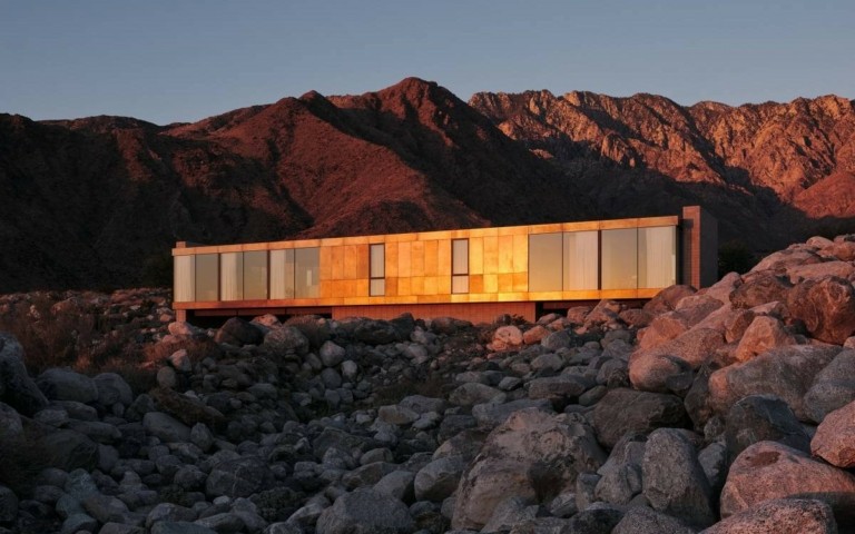 Ο απλός, χαμηλός και γραμμικός όγκος της καμουφλάρεται τέλεια στο σκληρό, άνυδρο τοπίο των βουνών Santa Rosa και San Jacinto. Στο εσωτερικό, ο στόχος ήταν να αναπαράγουν την ομορφιά της ερήμου, με μια παλέτα σιωπηλών χρωμάτων -πράσινο του φασκόμηλου, σκονισμένο ροζ και καφέ- εμπνευσμένη από το τοπίο. Τόσο οι ιδιωτικοί όσο και οι κοινόχρηστοι χώροι βρίσκονται σε ένα ενιαίο επίπεδο. Τα μεγάλα γυάλινα ανοίγματα προσκαλούν τη φύση στο εσωτερικό και η πρόσοψη από πατιναρισμένο ορείχαλκο κάνει το σπίτι να λαμπυρίζει διακριτικά από απόσταση, σαν ένα στολίδι στην έρημο.