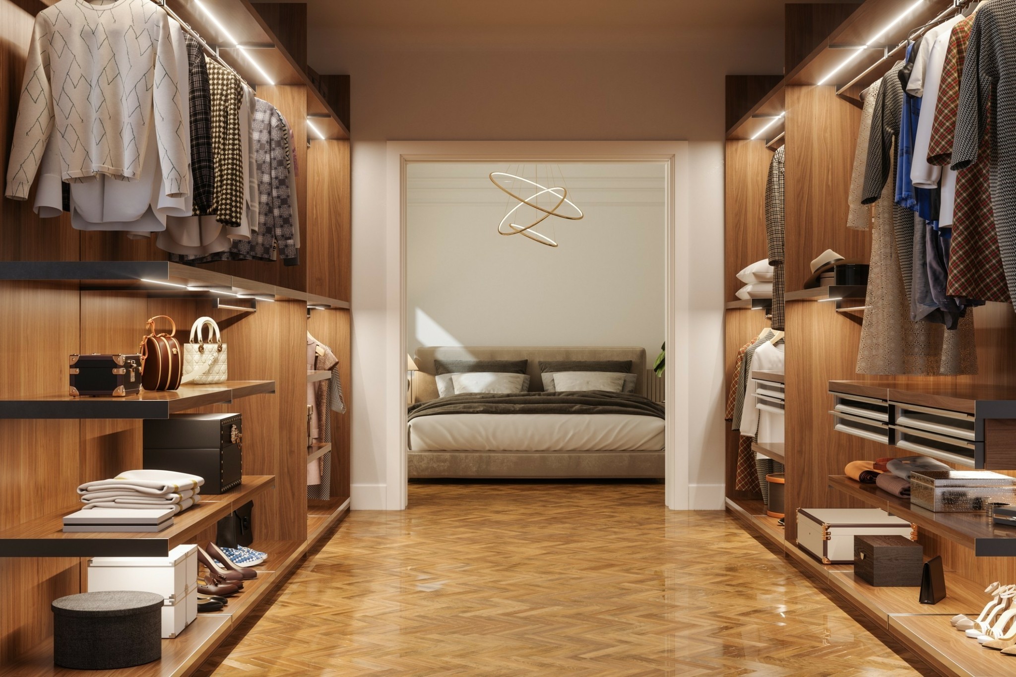 Οι ντουλάπες διαθέτουν χαρακτηριστικά όπως θήκες κοσμημάτων που ξεκλειδώνουν με δακτυλικό αποτύπωμα, περιστρεφόμενα ράφια παπουτσιών, εντοιχισμένα κουρδιστήρια ρολογιών. Oι σχεδιαστές δημιουργούν ειδικά σχεδιασμένες προθήκες για τα σπάνια ή εκκεντρικά αξεσουάρ των πελατών τους – όπως ένα ζευγάρι Chanel πατίνια! Πολυέλαιοι, έργα τέχνης, χαλιά με λεοπάρ σχέδια, χερούλια από δέρμα ή κέρατο – η διακόσμηση δεν χρειάζεται να ταιριάζει με το υπόλοιπο σπίτι καθώς το walk-in closet δεν είναι κοινόχρηστος χώρος.