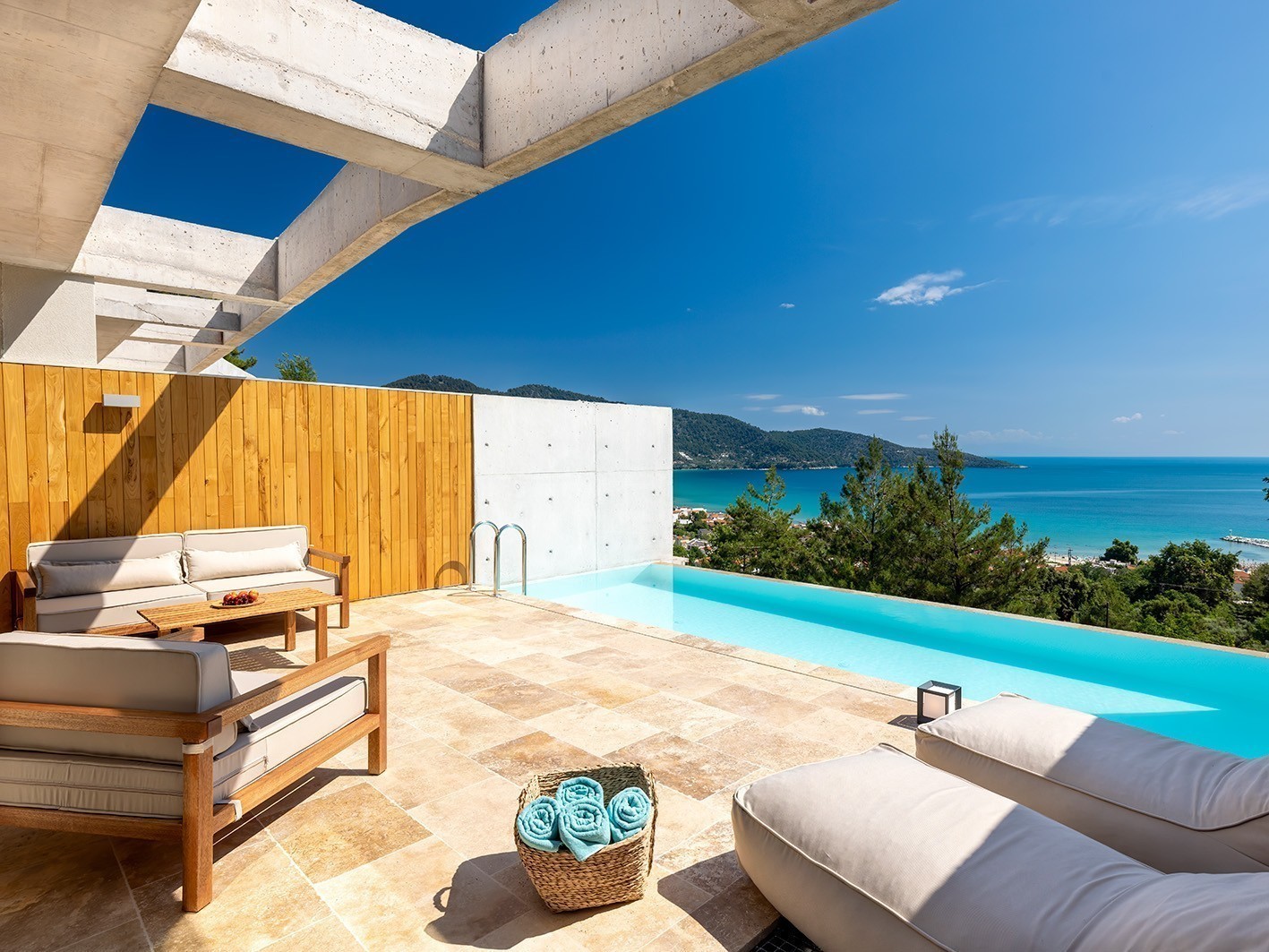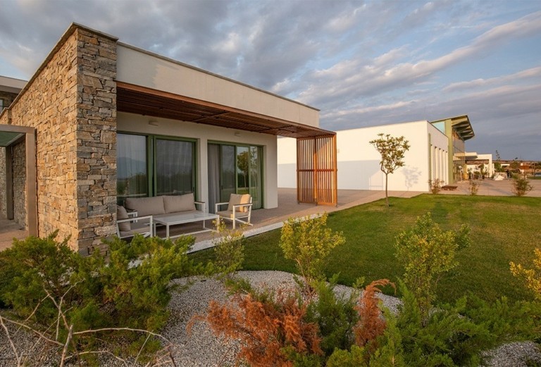 Επιπλέον, σε ένα προνομιακό και ήσυχο υπερυψωμένο σημείο της Ηρακλείτσας, η Villa Urania είναι μια εντυπωσιακή πολυτελής βίλα, σχεδιασμένη με μοναδικό εσωτερικό χαρακτήρα, σύγχρονες ανέσεις και χειροποίητη φιλοξενία. Ο συνδυασμός των γήινων χρωμάτων του μπεζ με το φυσικό τοπίο της προσφέρουν μια μοναδική αίσθηση αρμονίας. Στους εξωτερικούς χώρους της βίλλας, όπως το προαύλιο, η πισίνα και το BBQ επιλέχθηκε το φυσικό υλικό Τραβερτίνο Σαγρέ με την επιλογή να γίνεται βάση της αντιολισθητικής ιδιότητας του υλικού και της αισθητικής που προσδίδει στον χώρο.