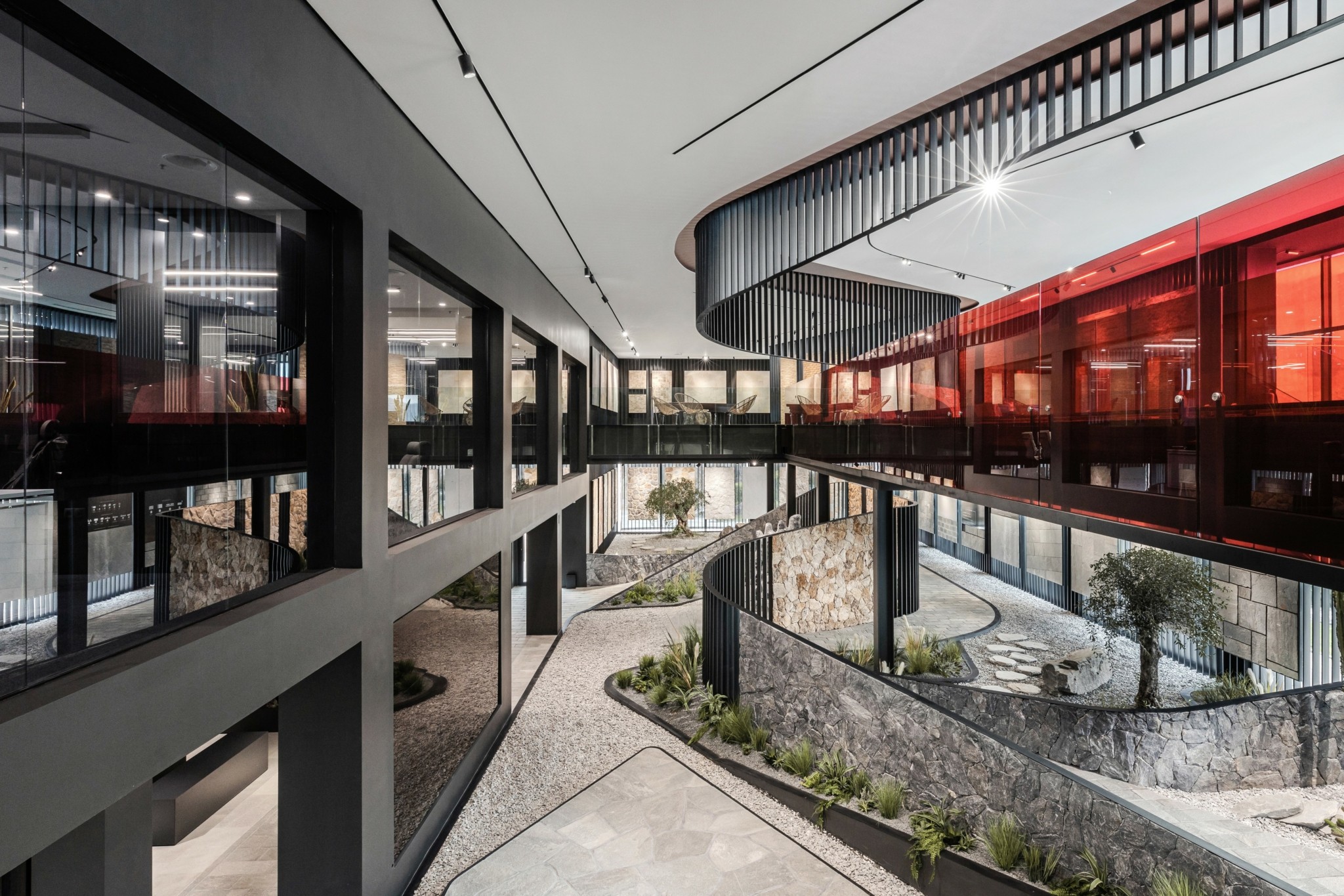 Ίσως να μην περιμένει κανείς τόσο μοντέρνα εταιρικά γραφεία στην άλλη άκρη της Ελλάδας. Το showrooom της εταιρείας Akrolithos, ένας χώρος 3.000 τετραγωνικών μέτρων, κατασκευάστηκε μεταξύ 2020 και 2023 και αποτελεί αρχιτεκτονική σύνθεση του γραφείου KAAF architects Kitriniaris Associates Architecture Firm. Η διαδρομή για τον επισκέπτη ξεκινά από την είσοδο, συνεχίζεται μέσα από το τοπίο του ισογείου, περνάει από το “μουσείο” του λατομείου και καταλήγει στον εκθεσιακό χώρο του πρώτου ορόφου. Το δάπεδο είναι κατασκευασμένο από Σχιστόλιθο Καβάλας, ενώ άλλα σημεία διακοσμούνται από νησίδες σχιστόλιθου και μοκέτα. Οι χώροι των γραφείων αναπτύσσονται σε τρία επίπεδα, τα οποία επικοινωνούν μεταξύ τους μέσω ενός αιθρίου και μιας ελικοειδούς σκάλας που προκαλεί μια μοναδική εμπειρία στον επισκέπτη. Η αρχιτεκτονική σύνθεση συμπληρώνεται από μεγάλες πέτρες που έχουν μεταφερθεί από τα λατομεία της εταιρείας και τοποθετούνται σε συγκεκριμένα σημεία για να κατευθύνουν τη διαδρομή και την κίνηση στον χώρο.