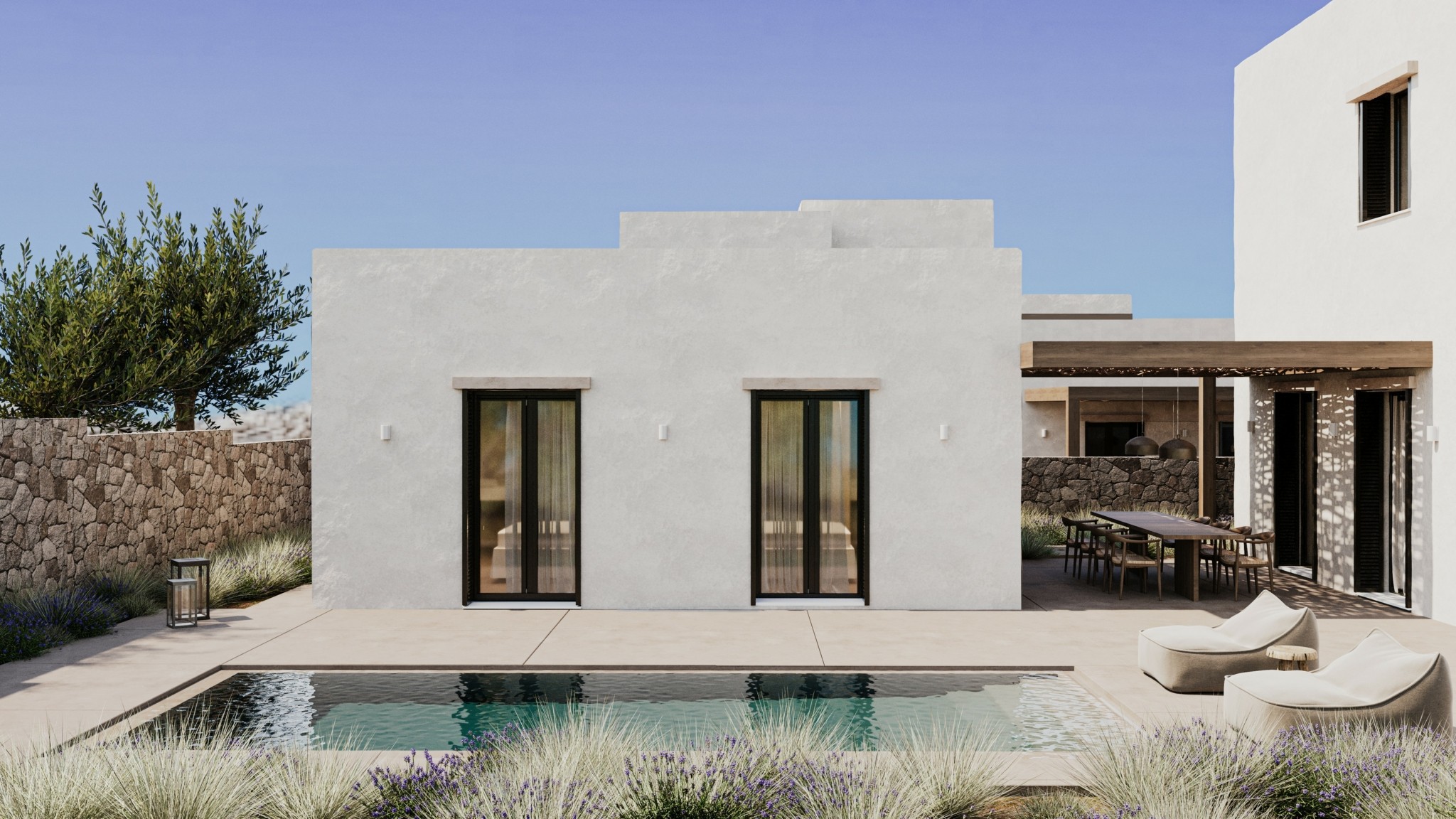 Η σύγχρονη τάση πλέον είναι η δημιουργία πολυτελών κατοικιών και ξενοδοχείων στην ευρύτερη περιοχή των Κυκλάδων. Σε αντίστιξη με τη συνθήκη αυτή, δική μας αποστολή ήταν ο επαναπροσδιορισμός του όρου της πολυτέλειας. Αναρωτηθήκαμε αρχικά, τι σημαίνει πολυτέλεια για εμάς και με ποιον τρόπο μεταφράζεται τελικά σε χώρο. Επιθυμία μας ήταν οι οικογένειες που θα ζήσουν εκεί, να έρθουν σε επαφή με τον τόπο, βιώνοντας την πολυτέλεια μέσα από την εμπειρία του χώρου και όχι από μία υπέρμετρη χρήση ακριβών υλικών. Η απλότητα του χώρου, η ανθρώπινη κλίμακα και η φυσικότητα των υλικών, αποτέλεσαν για εμάς τα συστατικά στοιχεία της νέας αυτής πολυτέλειας. Στην κατάσταση αυτή που θέλαμε να δημιουργήσουμε, ταίριαξε απόλυτα το έργο του Ισπανού Andrew Trotter, ο οποίος πρεσβεύει με τον ίδιο τρόπο την ένταξη στο φυσικό τοπίο μέσα από μια minimal αισθητική με απλές γραμμές, φυσικά υλικά και γήινα χρώματα.