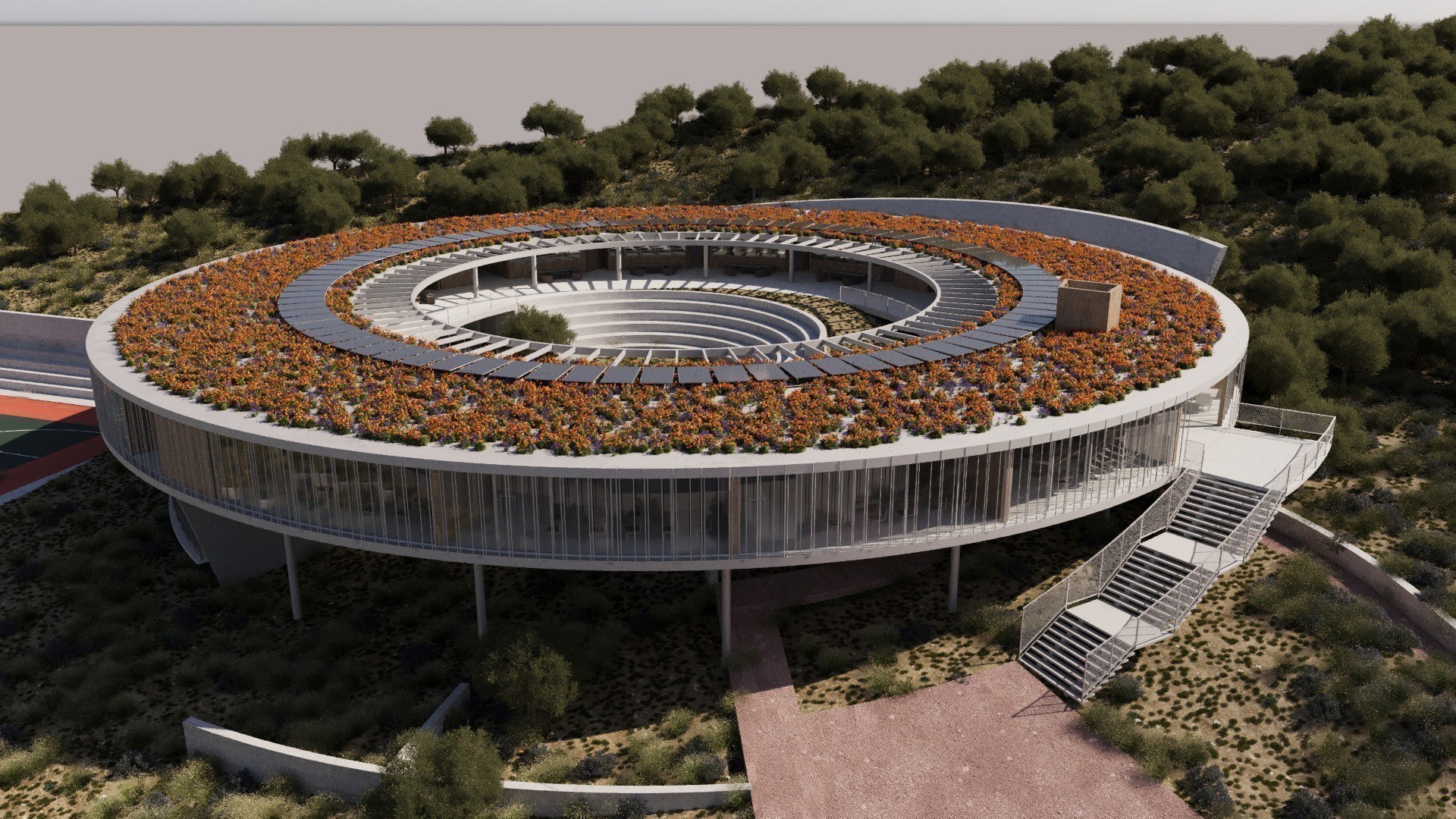 Θεωρώ ότι το περιβάλλον που ζούμε ή εργαζόμαστε ή πηγαίνουμε σχολείο, μπορεί να έχει φτιαχτεί με τέτοιο τρόπο που να πεις ότι σου αλλάζει τη ζωή. Σχεδιάζω λοιπόν ένα σχολείο το οποίο θεωρώ ότι θα φτιάχνει τη διάθεση και των μαθητών και του διδακτικού προσωπικού. Βρίσκεται επιπλέον σε ένα πολύ ωραίο σημείο, τις παρυφές του Υμηττού, άρα και στις παρυφές της πόλης, οπότε ο περιβάλλοντας χώρος είναι πολύ σημαντικός. Τα σχολεία τα έχουμε λίγο περιχαράξει και “μαντρώσει” κι έχουμε τσιμεντώσει τα πάντα λες και το χώμα είναι κάτι περίεργο. Αυτό για μας δεν ισχύει. Όπως και στον παιδικό σταθμό που φτιάξαμε το να λερωθεί το παιδί δεν είναι πρόβλημα. Στον παιδικό σταθμό μας έλεγαν “μα εκεί μπορεί να πέσει το παιδί”. Τα παιδιά όμως δεν είναι χαζά. Κι αν πέσουν μια φορά, μαθαίνουν για να μην το ξανακάνουν. Φαντάζομαι λοιπόν, μια συνεχή κίνηση και θεατρικότητα στο χώρο. Θα βγαίνουν έξω στο διάλειμμα και θα γίνεται μια “περατζάδα” σαν ένα μεγάλο αίθριο. Μπορείς να είσαι στο διάδρομο και να κοιτάς παντού. Υπάρχει μια θεατρικότητα και αλληλεπίδραση όλων μέσα στον χώρο. Σαν να έχει προσγειωθεί το κτίριο σε ένα κεκλιμένο επίπεδο.
