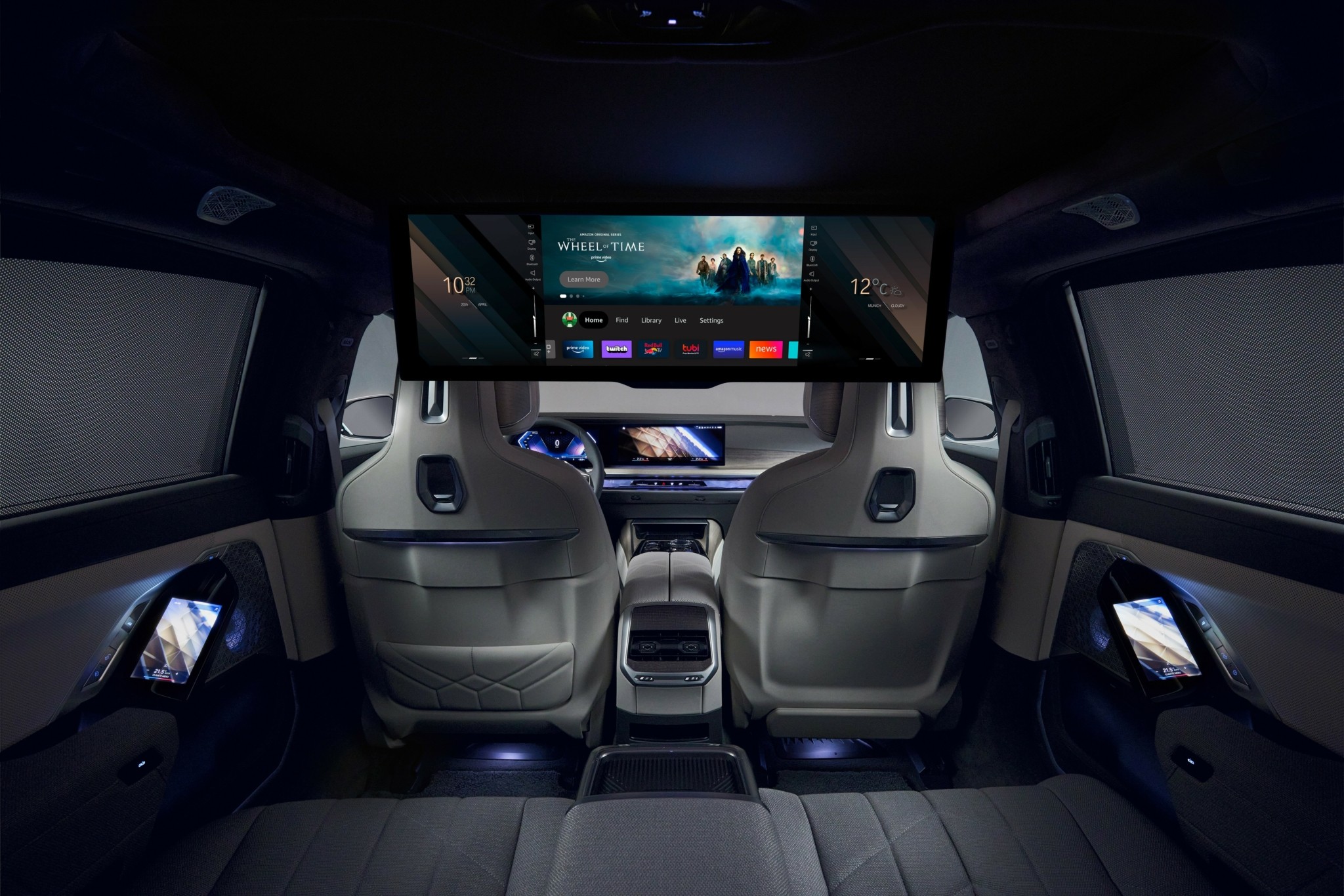 Οι πίσω επιβάτες μπορούν να απολαμβάνουν μία μοναδική προσφορά στον τομέα της ψυχαγωγίας, με τη μορφή της νέας BMW Theatre Screen – μιας πανοραμικής οθόνης 31,3” σε διάταξη 32:9 και ανάλυση 8K, που εκτείνεται από την οροφή προς τα κάτω και μεταμορφώνει τη δεύτερη σειρά καθισμάτων σε αποκλειστικό ιδιωτικό σινεμά πάνω σε τροχούς. Ο οδηγός και ο συνοδηγός μπορούν επίσης να χρησιμοποιούν YouTube video-on-demand streaming στην οθόνη ελέγχου για πρώτη φορά. Ενα σύστημα κεραίας, συμβατό με 5G, φροντίζει για συνδεσιμότητα υψηλής ταχύτητας (η τιμή δεν είναι διαθέσιμη ακόμη).