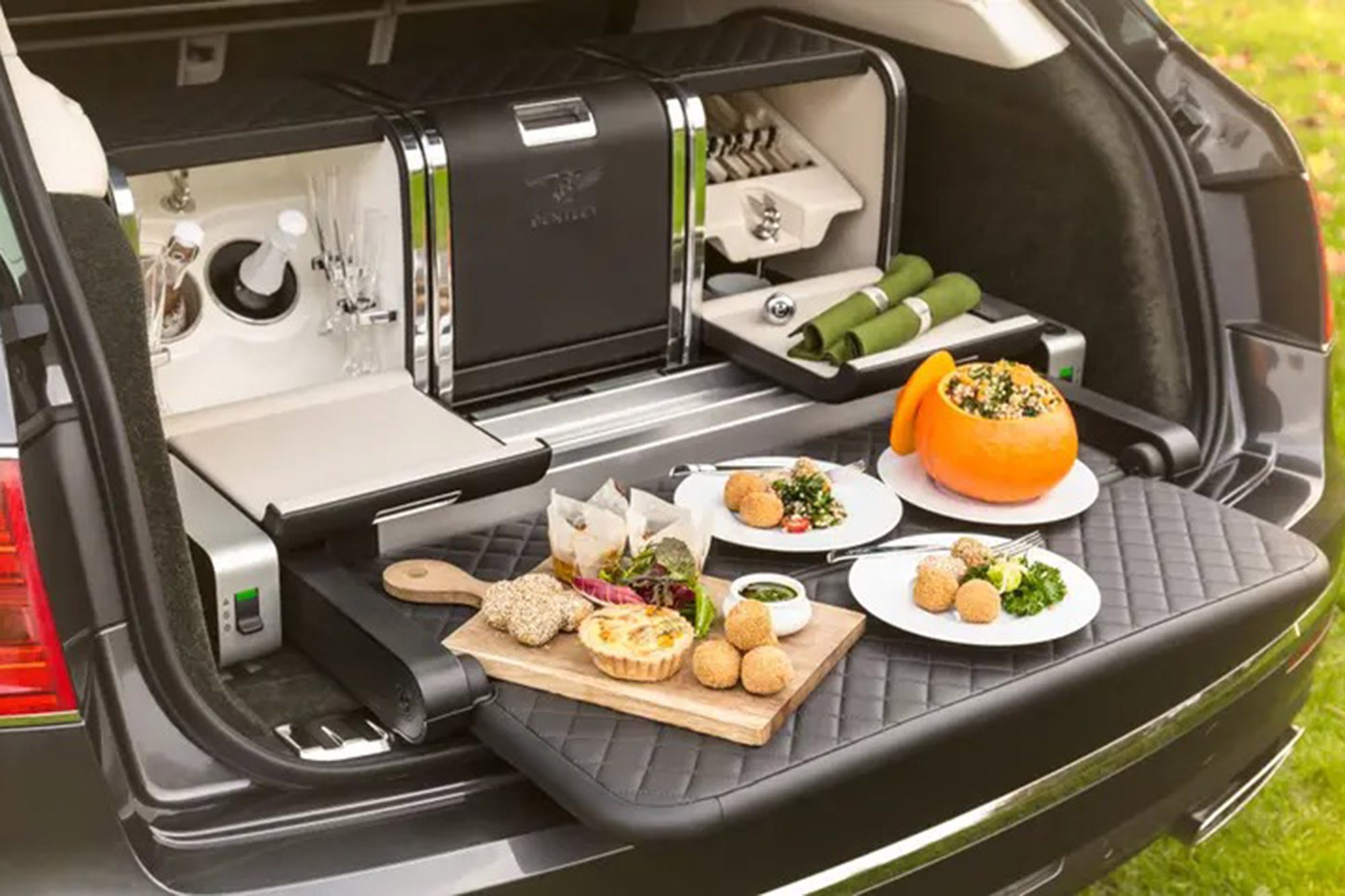Τα πολυτελή SUV ξεπερνιούνται εύκολα αυτές τις ημέρες και γι’ αυτό η Bentley έχει ακόμα μερικούς άσσους στο μανίκι της από το τμήμα Mulliner της εταιρείας. Εκεί, ειδικοί στην κατασκευή αμαξωμάτων και στην εκπλήρωση επιθυμιών φτιάχνουν ότι τους ζητηθεί. Για την Bentayga έχουν φτιάξει έναν χώρο που έχει έναν μικρό θερμοθάλαμο για να διατηρεί το φαγητό ζεστό και ένα μικρό ψυγείο για το κρασί ή τις… μπύρες. Η διάταξή τους είναι τέτοια που μπορείτε να μεταφέρετε και… σούπα χωρίς να χυθεί. Το κάτω μέρος της πίσω πόρτας γίνεται και κάθισμα για να φάτε άνετα. Μην ανησυχείτε επίσης για την ποιότητα, αφού η Mulliner διαθέτει πιάτα από ειδική πορσελάνη, μαχαιροπίρουνα και κρυστάλλινα ποτήρια. Για την εγκατάσταση αυτή στο πίσω μέρος της Bentayga πρέπει να πληρώσετε πάνω από 22.500 ευρώ.
