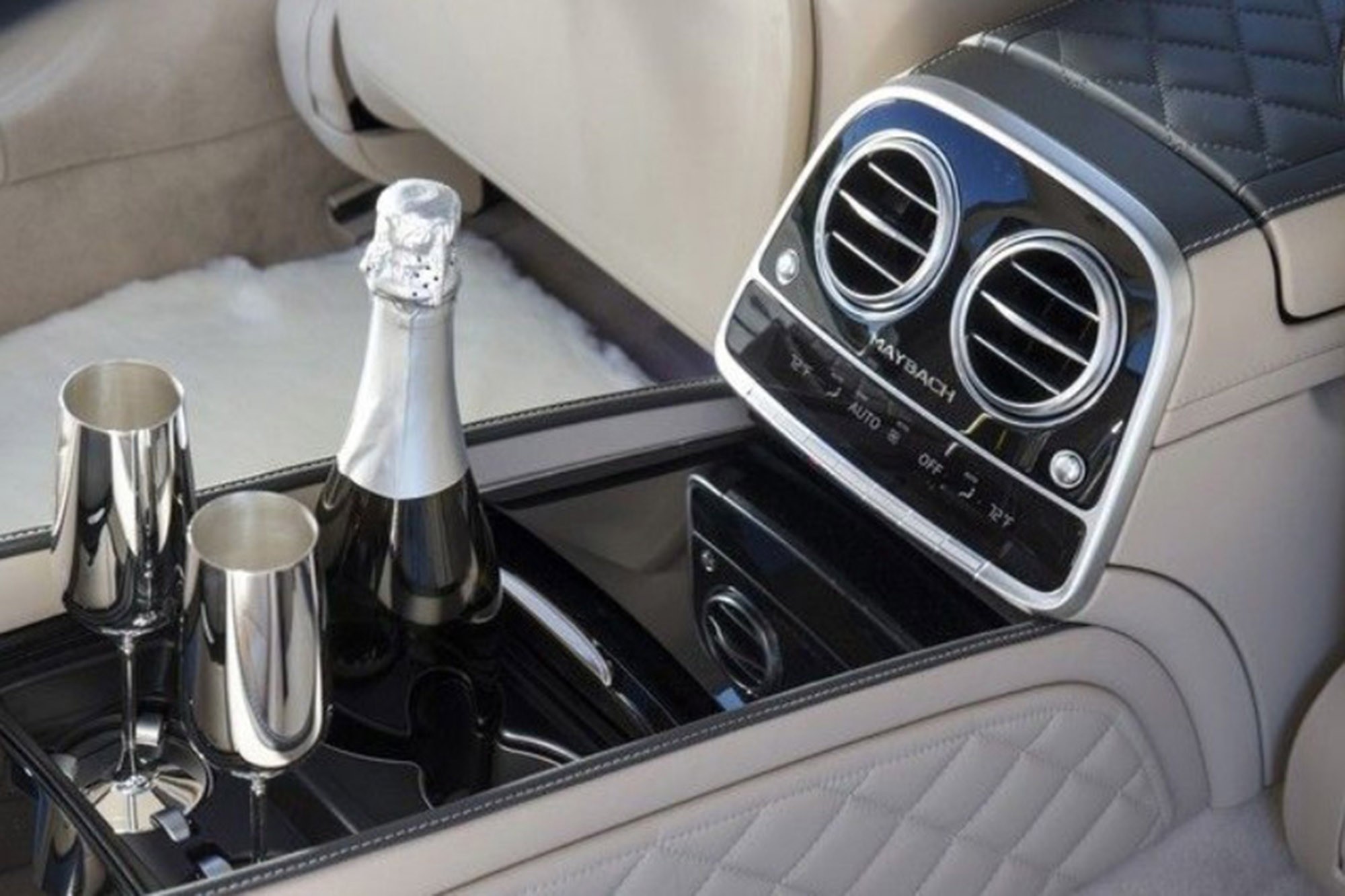 Η σειρά Mercedes-Maybach S Class First Class διαθέτει δύο επιλογές για τα πίσω καθίσματα. Προσφέρονται τα παραδοσιακά τρία πίσω καθίσματα, ή εναλλακτικά μπορείτε να επιλέξετε δύο μεμονωμένα καθίσματα που χωρίζονται από μια κονσόλα που κρύβει δύο πτυσσόμενα τραπέζια, ένα ψυγείο και δύο ασημί -επιμεταλλωμένα ποτήρια σαμπάνιας που έχουν ακόμη και τις δικές τους θήκες για να πιάνουν στη βάση τους και να μην ανατρέπονται. Αυτά τα ποτήρια κατασκευάζονται από Γερμανούς ειδικούς και τη βιομηχανία ασημικών Robbe and Berking. Το πακέτο εξοπλισμού που τα περιλαμβάνει κοστίζει περίπου 50.000 ευρώ.