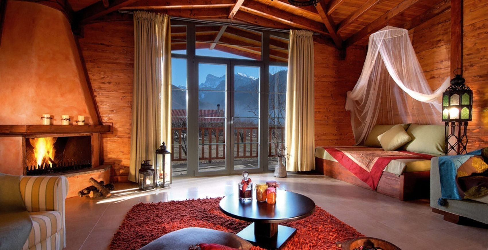 Το άνετο σαλόνι θα γίνει το σημείο όπου με τη θέα στην κορυφή της Γκαμήλας και της Τύμφης, θα περάσετε δημιουργικά τον χρόνο σας. Ανάψτε το τζάκι και περάστε χαλαρωτικές βραδιές με τους αγαπημένους σας. To ξενοδοχείο διαθέτει 8 αυτόνομες ξύλινες σουίτες, μέσα σε μία έκταση 30 στρεμμάτων, με αμυγδαλιές, αμπέλια, ελιές και οπωροφόρα δέντρα. Με μόλις 8 σουίτες 45 και 65 τετραγωνικών αντίστοιχα και κάθε μια να διαθέτει το δικό της τζάκι.