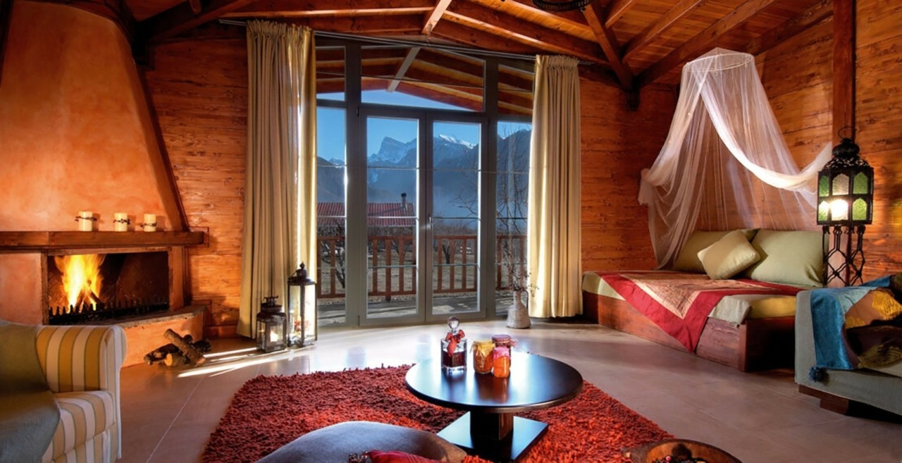 Το άνετο σαλόνι θα γίνει το σημείο όπου με τη θέα στην κορυφή της Γκαμήλας και της Τύμφης, θα περάσετε δημιουργικά τον χρόνο σας. Ανάψτε το τζάκι και περάστε χαλαρωτικές βραδιές με τους αγαπημένους σας. To ξενοδοχείο διαθέτει 8 αυτόνομες ξύλινες σουίτες, μέσα σε μία έκταση 30 στρεμμάτων, με αμυγδαλιές, αμπέλια, ελιές και οπωροφόρα δέντρα. Με μόλις 8 σουίτες 45 και 65 τετραγωνικών αντίστοιχα και κάθε μια να διαθέτει το δικό της τζάκι.