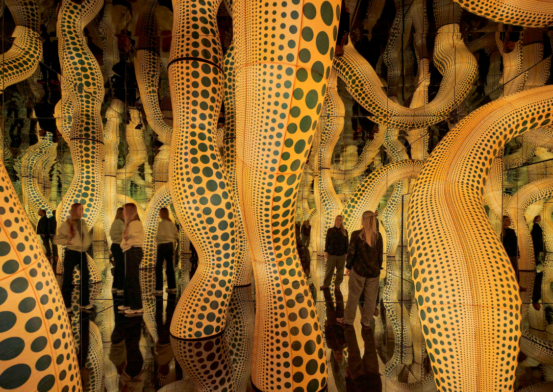 Έως το τέλος του μήνα, οι αίθουσες του μουσείου θα φιλοξενούν τις χιλιάδες φωτεινές κουκκίδες της, τις καθηλωτικές εγκαταστάσεις με τα γιγάντια φουσκωτά μαύρα και κίτρινα πλοκάμια, τα περίφημα Infinity Mirror Rooms που δημιουργούν την αίσθηση του απείρου και τα γλυπτά που απεικονίζουν κολοκύθες. Όπως επισημαίνει το Fondation Beyeler, η έκθεση αναδεικνύει την ποικιλία των καλλιτεχνικών μέσων της 96χρονης Γιαπωνέζας καλλιτέχνιδας, από ζωγραφική, γλυπτική, κολάζ και εγκαταστάσεις έως χάπενινγκς, μόδα και λογοτεχνία και προσφέρει μια ολοκληρωμένη επισκόπηση επτά δεκαετιών δημιουργίας.