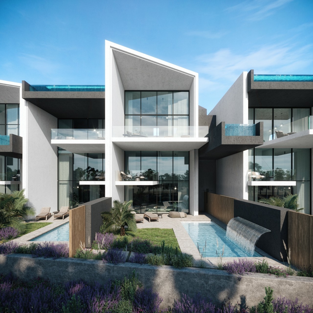 Σε μικρή απόσταση από τη θάλασσα, διαμορφώνεται ένα σύγχρονο συγκρότημα δέκα κατοικιών οργανωμένο σε πέντε διακριτούς όγκους. Η οργάνωση των όγκων ακολουθεί σαφή διάκριση μεταξύ χαμηλών και υψηλών επιπέδων: Ισόγειο και πρώτος όροφος για την πρώτη κατοικία, δεύτερος και τρίτος για τη δεύτερη. Βασικός στόχος του σχεδιασμού ήταν η επίτευξη πλήρους ιδιωτικότητας για κάθε κατοικία, παρά την άμεση γειτνίαση των μονάδων. Οργάνωση χώρων, χάραξη κινήσεων και επιλογές υλικών συνεργάζονται προς αυτή την κατεύθυνση. Όλες οι κατοικίες διαθέτουν πλήρες σύνολο παροχών, κατανεμημένων με τέτοιο τρόπο ώστε να εξασφαλίζεται η αίσθηση απόλυτης ανεξαρτησίας και αυτονομίας. Διπλού ύψους καθιστικά με υαλοπετάσματα από το δάπεδο έως την οροφή ενισχύουν τη φωτεινότητα την ευρυχωρία καθώς και τον ορίζοντα, ενώ κάθε κατοικία περιλαμβάνει ιδιωτική πισίνα.