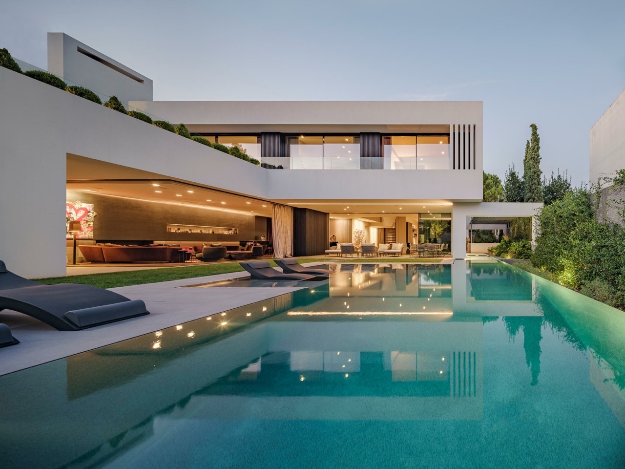 Παρότι έχουμε συνηθίσει να μπαίνουμε πρώτα στον κήπο του σπιτιού και μετά στο κτίριο, τώρα τελευταία έχει αντιστραφεί η τάση και βλέπουμε πρώτα το κτίριο και μετά τον κήπο. Ισως γιατί η ιδιωτικότητα είναι πλέον πιο πολύτιμη από πριν. Αλλά και τα οικόπεδα όπως και οι συντελεστές δόμησης ίσως να μην επέτρεπαν να μπει ο κήπος πίσω γιατί ήταν έτσι φτιαγμένος και κατανεμημένος ο χώρος ώστε να μη βγαίνει μεγάλος ο κήπος αν φτιαχνόταν πίσω από το κτίριο. Στο συγκεκριμένο οικόπεδο “κολλούσε” πιο πολύ. “Θα έλεγα ότι η καλύτερη στιγμή που βλέπουμε τους καρπούς του μόχθου μας είναι όταν μπαίνει το συνεργείο καθαρισμού, καθαρίζουν όλα, μπουν τα νερά στην πισίνα και τελειοποιείται και ο κήπος. Τότε ξεπροβάλει το κτίριο σε όλο του το μεγαλείο. Τη μελέτη του φωτισμού την ανέλαβε ο Δημήτρης Νατσίκας και πράγματι όταν μπουν και τα φώτα τη νύχτα, το αποτέλεσμα είναι εντυπωσιακό”. Η παλέτα χρωμάτων και υλικών υπηρετεί τον μινιμαλισμό, με άφθονες λευκές επιφάνειες στους τοίχους και τα εντοιχισμένα ντουλάπια και σκούρα ξύλινα δάπεδα. Τα ανθρακί γκρι κεραμικά και οι πέτρες συμπληρώνουν το μοντέρνο εσωτερικό, επιπλωμένο με άνετα έπιπλα και χαλιά που προσθέτουν πλούσιες πινελιές χρώματος παντού.