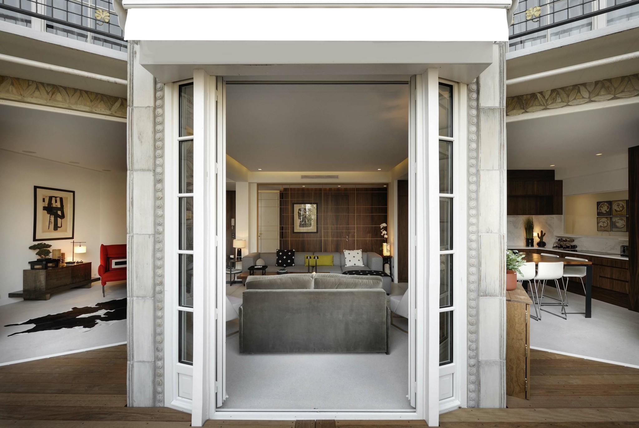H Eλληνίδα αρχιτέκτονας ήθελε να ελαφρύνει το γαλλικό ντεκόρ που ήταν φορτωμένο με ταπετσαρίες, ξύλινες κορνίζες, φορτωμένη ξύλινη οροφή. “Παρότι το κτίριο ήταν πολύ πιο σύγχρονο απ΄την δεκαετία του ’20, στις αρχές δηλαδή του μοντερνισμού, εσωτερικά ήταν ένα πάρα πολύ μπαρόκ διακοσμημένο. Αυτό οφειλόταν στον προηγούμενο ιδιοκτήτη. Προτιμήσαμε τη μοντέρνα εις βάρος της κλασσικής γαλλικής διακόσμησης”.