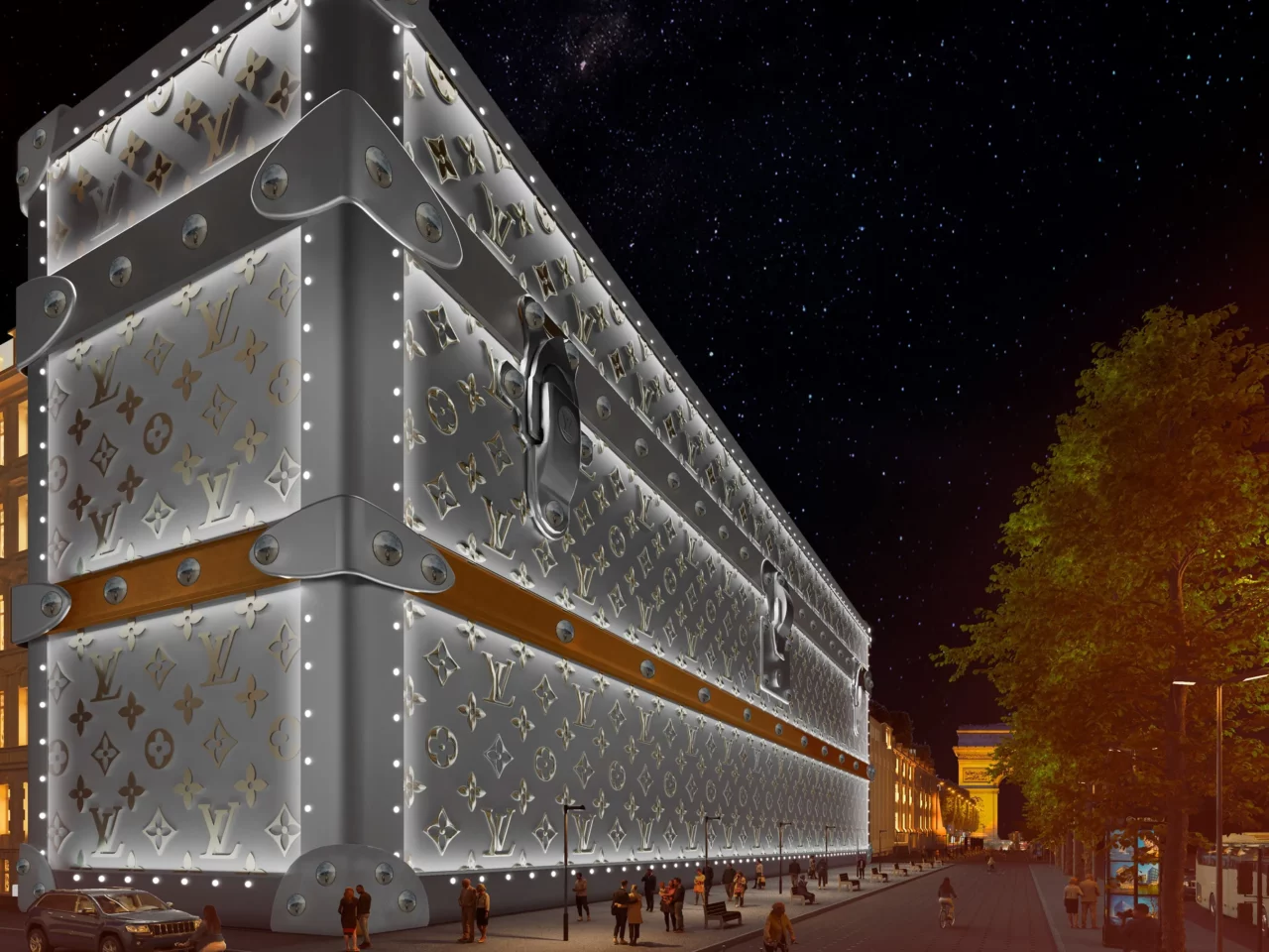 Στην πρόσοψη αποτυπώνεται ήδη η πλούσια κληρονομιά της μάρκας. Έξυπνα σχεδιασμένη για να απεικονίζει ένα από τα εμβληματικά μπαούλα του Louis Vuitton, η προσωρινή κάλυψη έχει μετατρέψει το εργοτάξιο σε σύμβολο πολυτέλειας και ιστορικής κληρονομιάς. Το μπαούλο, ο ακρογωνιαίος λίθος της ιστορίας του οίκου, σηματοδοτεί το ταξίδι και την τεχνογνωσία του στις πολυτελείς αποσκευές. Αυτή η δημιουργική προσέγγιση όχι μόνο αποτίει φόρο τιμής στις ρίζες της μάρκας, αλλά θεωρείται αξιοθέατο για τους περαστικούς και τους τουρίστες, αποτελώντας ένα προσωρινό αλλά εμβληματικό μέρος του αστικού τοπίου του Παρισιού.