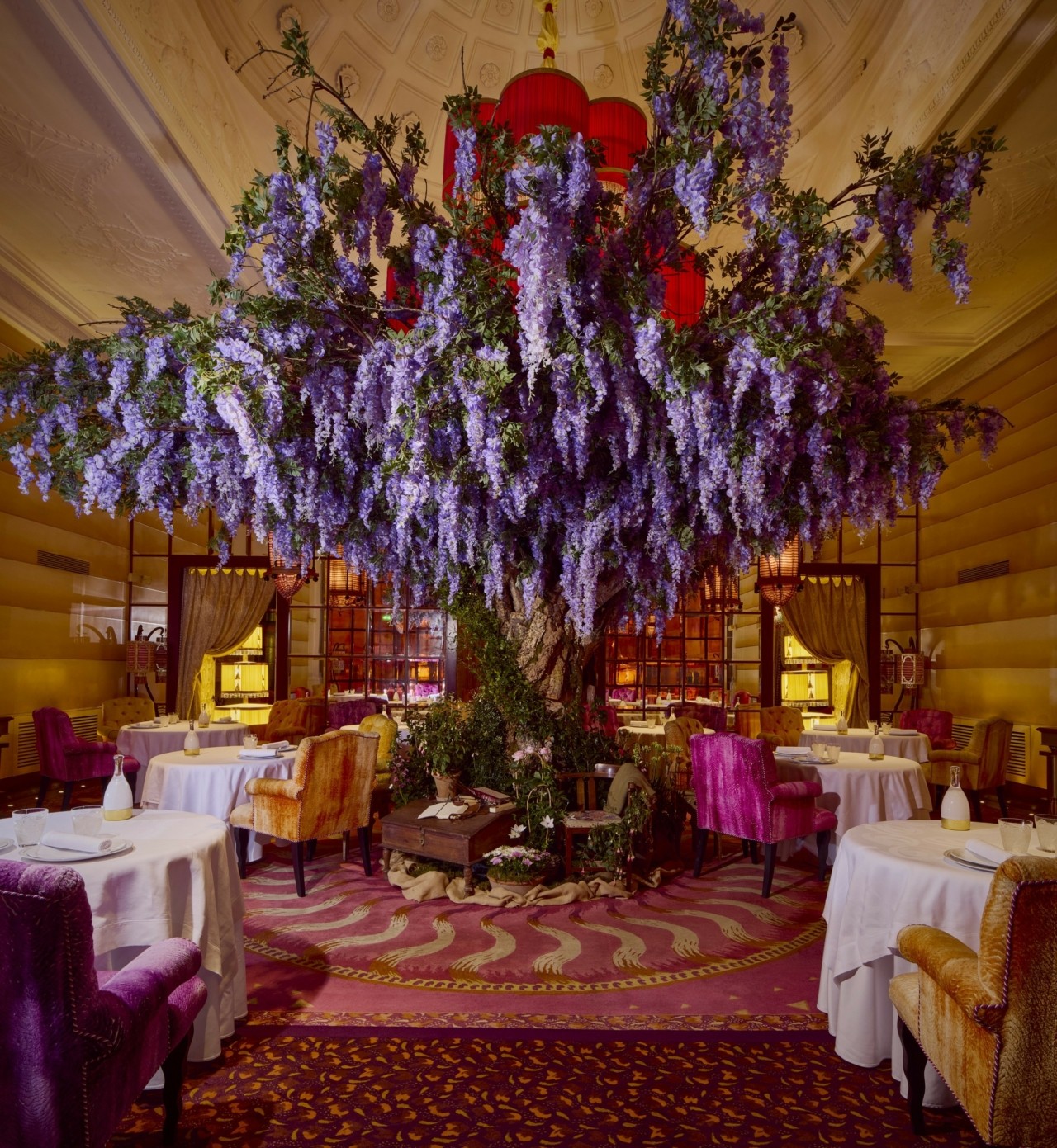 Στο “The Glade” η ίδια ομάδα συνεχίζει την floral μαγεία με έναν ουράνιο θόλο από δαντελένιες ομπρέλες γεμάτες λουλούδια. Αναφορές στο Mansfield Park ξεπηδούν παντού, με την ατμόσφαιρα να θυμίζει το πιο φίνο picnic στην εξοχή -ντελικάτο, ανέμελο και απόλυτα κομψό Στο “The Lecture Room & Library” ο Rob Van Helden σχεδιάζει ένα συγκλονιστικό δέντρο από γλιστρίδα και μοσχοκάρυδο, του οποίου τα κλαδιά διακλαδώνονται κάτω από τον πολυέλαιο της αίθουσας, θυμίζοντας τις πολυεπίπεδες αφηγήσεις της Όστεν, με πολυτελείς αποχρώσεις λιλά και βαθυπόρφυρου να αναδεικνύουν τη γοητεία του χώρου.