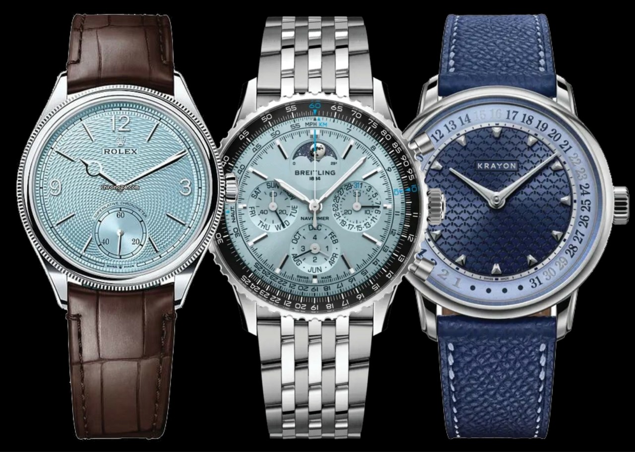 Οι σχεδιαστές ρολογιών αγκαλιάζουν το μπλε για τη γοητεία και την αξεπέραστη ευελιξία του. Από το δημοφιλές Ice Blue της Breitling και της Rolex έως το ιδιαίτερο Stone Blue της Parmigiani, που διαθέτει γκριζωπούς και ουδέτερους υποτόνους, οι μπλε αποχρώσεις προσδίδουν κομψότητα και λάμψη στον καρπό.