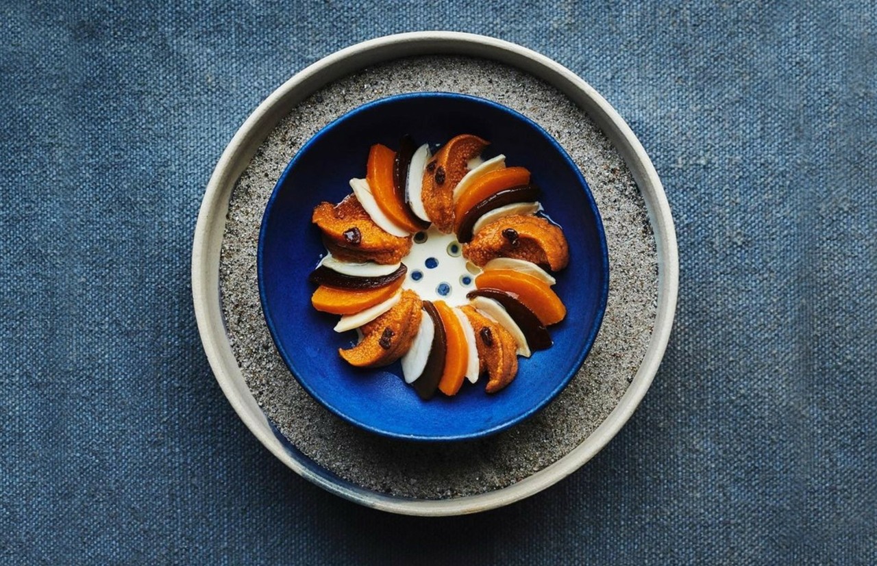 Εισαγωγική φωτογραφία: Αχινός με κολοκύθα, αλατισμένα αμύγδαλα, φύκια και τριαντάφυλλο