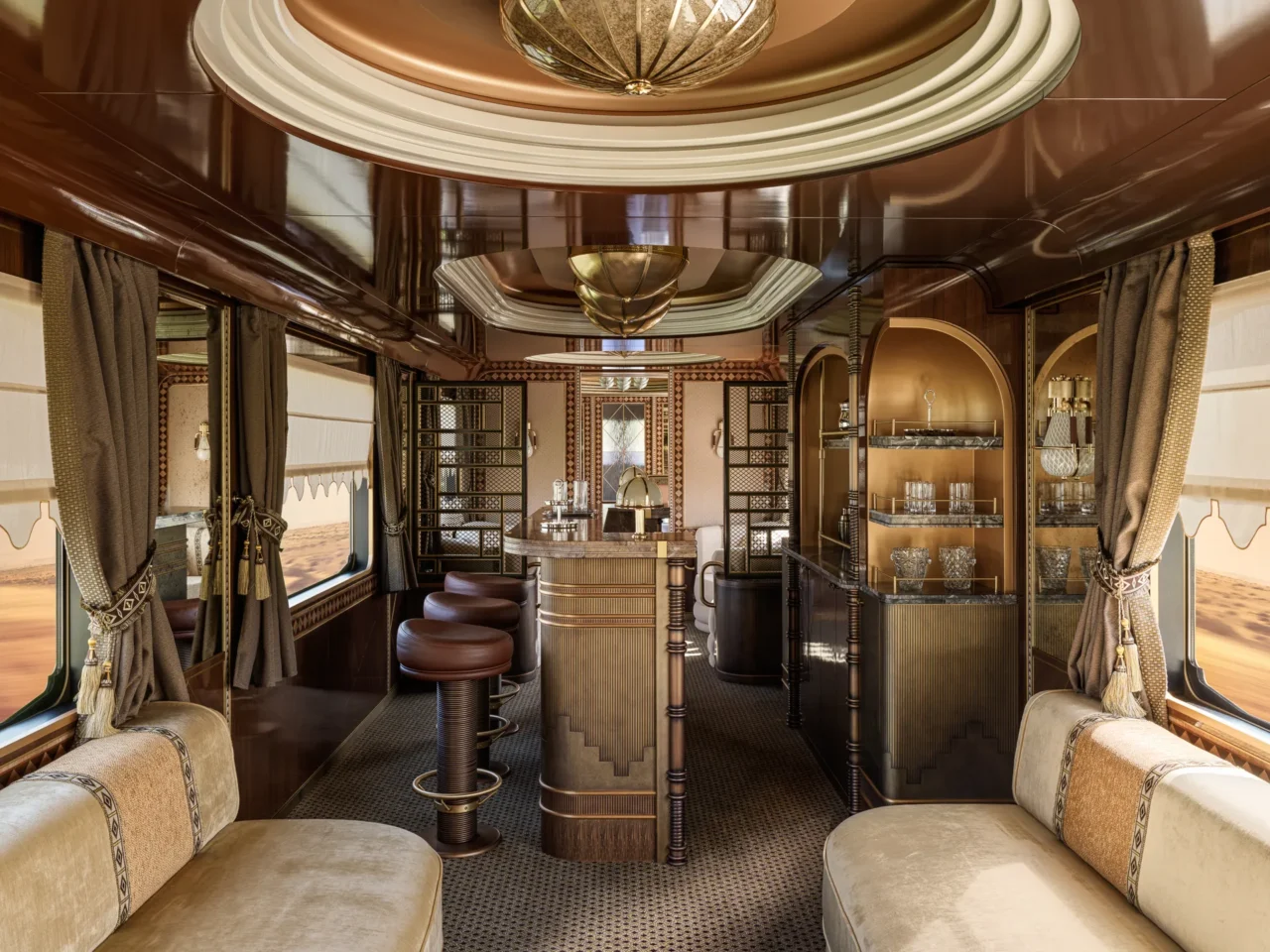 Η ιδέα πίσω από το Dream of the Desert, που αναπτύχθηκε σε συνεργασία με τους Σιδηροδρόμους της Σαουδικής Αραβίας και το Υπουργείο Πολιτισμού της χώρας, ήταν η δημιουργία ενός ταξιδιωτικού προϊόντος που θα γεφυρώνει τη σαουδαραβική πολιτιστική κληρονομιά με τη σύγχρονη πολυτέλεια. Τον σχεδιασμό ανέλαβε το στούντιο της Λιβανέζας αρχιτέκτονα, Culture in Architecture, με έδρα το Παρίσι. Η d’Amman, που φέτος συμπεριλήφθηκε στο AD100 -την ετήσια λίστα του περιοδικού Architectural Digest με τους κορυφαίους αρχιτέκτονες και σχεδιαστές εσωτερικού χώρου- φαντάστηκε ένα τρένο που θα αντηχούσε τα μυστηριακά τοπία της ερήμου. Διακόσμησε τις 33 σουίτες του με ξύλινα μαρκετερί, πλούσια υφάσματα και μια παλέτα βαθιών, γήινων χρωμάτων εμπνευσμένων από την έρημο, μαζί με χρυσές πινελιές.