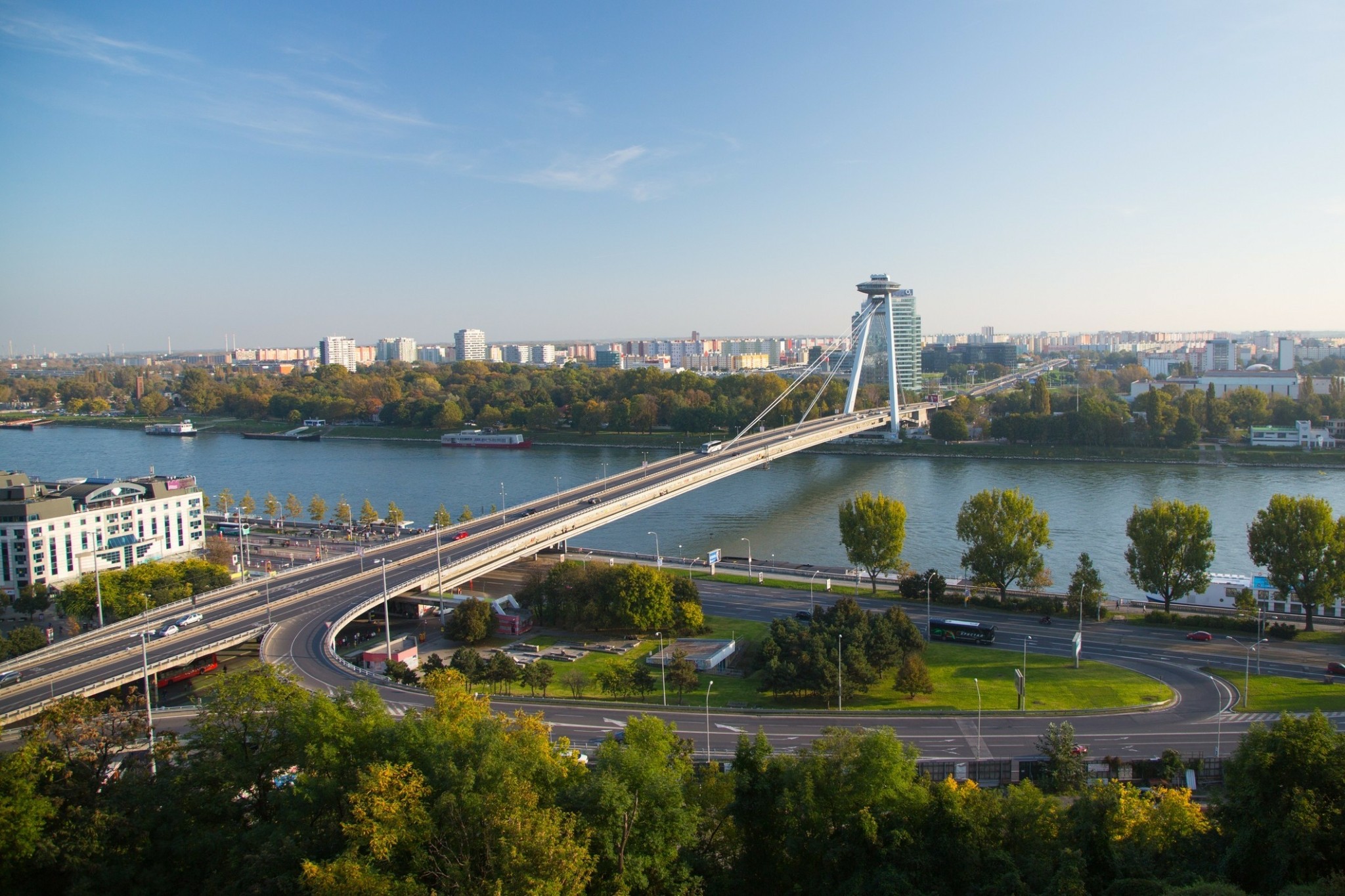Η παρουσία του Δούναβη κάθε άλλο περνά απαρατήρητη στην πόλη που χτισμένη καθώς είναι στο πρώτο από τα τρία μέρη του, απολάμβανε την εμπορική ανάπτυξη που προσέφερε η δίοδος μέσω του ποταμού στη Γερμανία και την Αυστρία. Η γέφυρα SNP, αν και δεν τυγχάνει του θαυμασμού όλων, είναι σίγουρα η εντυπωσιακότερη που διασχίζει τον διάσημο ποταμό. Ιδιαίτερα Avant-garde για την εποχή της, χτίστηκε μεταξύ 1962-1972, φέρει δύο πυλώνες όπου σε ύψος 95 μέτρων στεγάζουν το παρατηρητήριο UFO και ένα από τα καλύτερα γκουρμέ εστιατόρια της Σλοβακίας. Η κορυφαία γαστρονομική εμπειρία συνδυάζεται με θέα που κόβει την ανάσα και φτάνει ως τα 100 χλμ. μακριά. Οι ρομαντικοί, μετά το μαγευτικό από εδώ ηλιοβασίλεμα και πριν το δείπνο, μπορούν να βγουν στην εξωτερική ταράτσα για να βάλουν ένα λουκέτο με τα αρχικά τους στο ειδικά τοποθετημένο πλέγμα σε σχήμα καρδιάς.