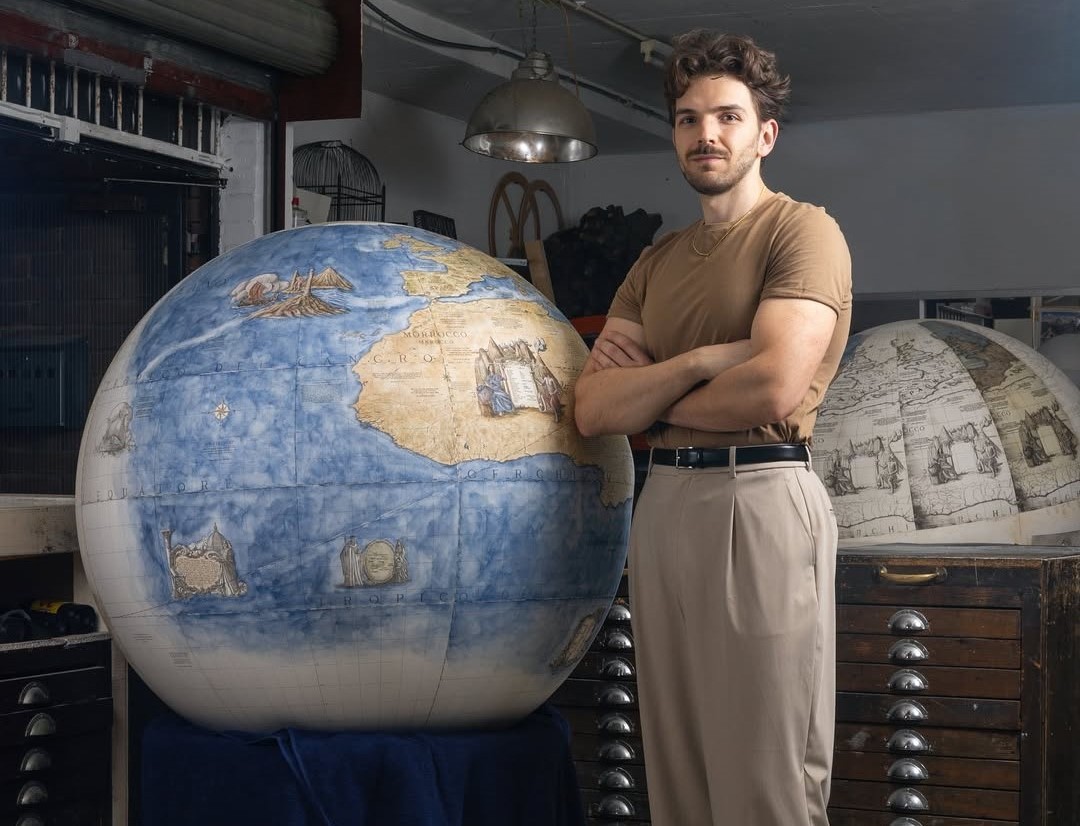 Με τον ίδιο ζήλο, φιλοτεχνεί και τις σφαίρες. Η διαδικασία μπορεί να είναι σύνθετη και χρονοβόρα, αλλά αυτό δεν αποτρέπει τον καλλιτέχνη. Τις διαμορφώνει από γύψο και ξύλο, χαράσσει χάλκινες πλάκες και εκτυπώνει με πρέσα τους χάρτες με χαρτί Fabriano που χρωματίζει με φυσικές χρωστικές ουσίες. Προκειμένου να εξασφαλίσει αυθεντικό και υψηλής ποιότητας αποτέλεσμα, παρασκευάζει ο ίδιος τα βερνίκια και τις κόλλες του.