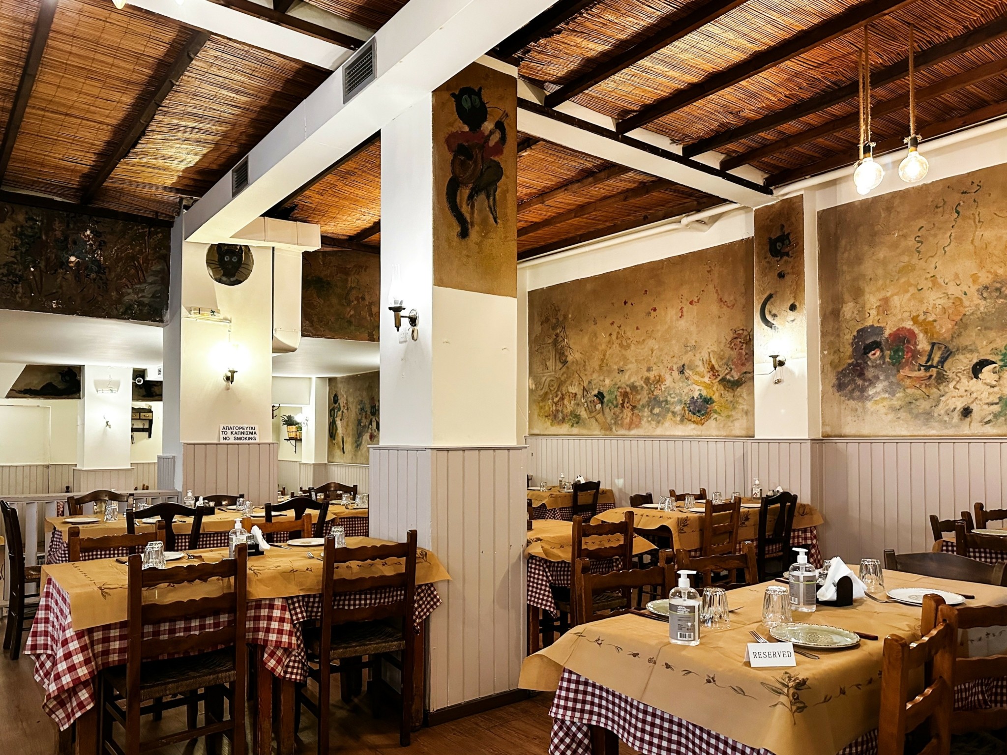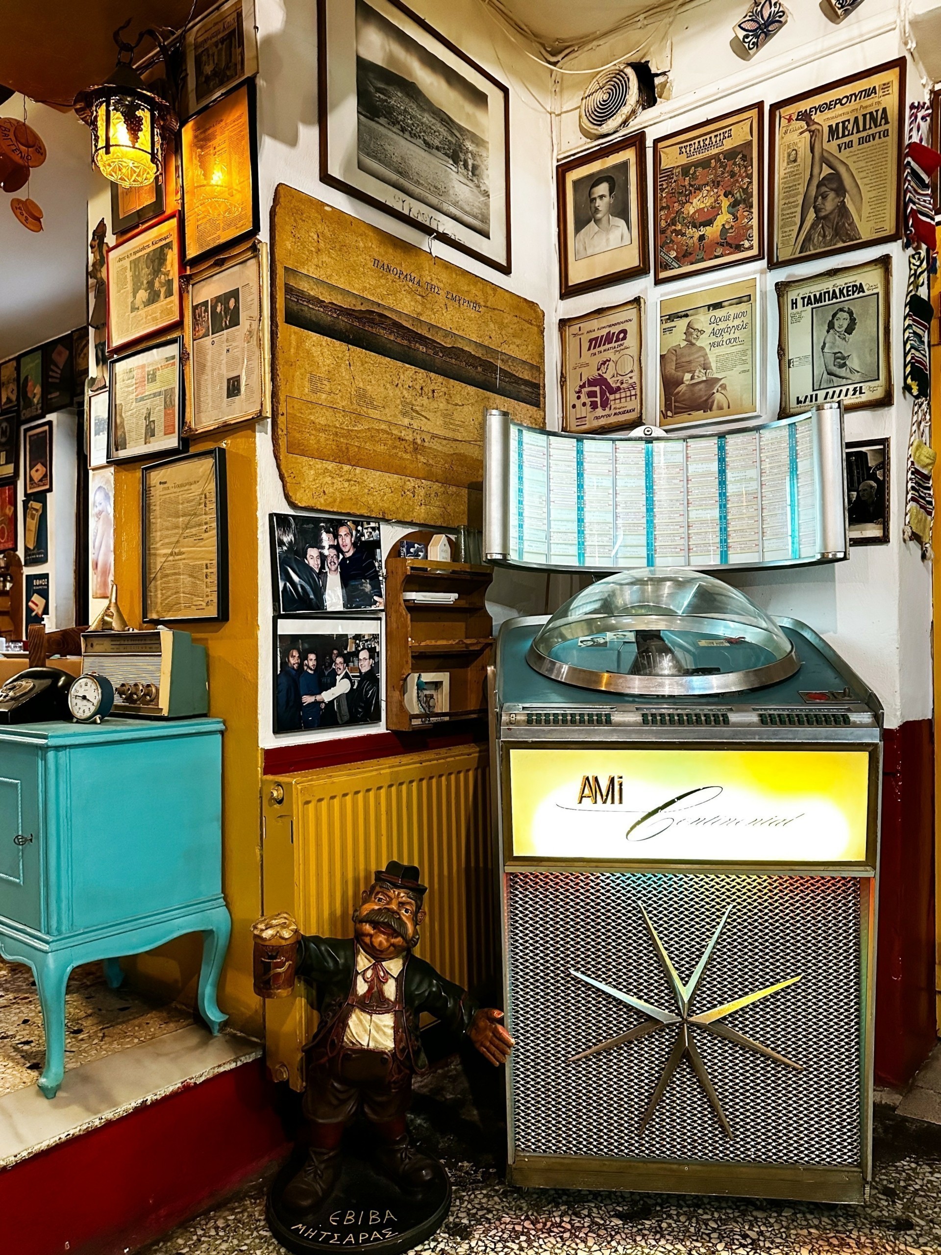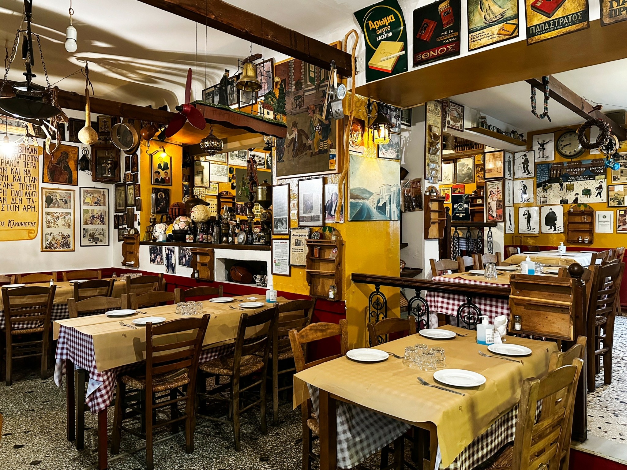 Το πεζοδρόμιο απέναντι από την ταβέρνα μετατράπηκε σε ευρύχωρη παραδοσιακή αυλή ενώ στον εσωτερικό χώρο το βλέμμα περιπλανιέται για ώρα στα αμέτρητα διακοσμητικά, ανάμεσα στα οποία προνομιακή θέση κατέχει το πανόραμα της Σμύρνης που έφερε ο παππούς Θεόφιλος στην Ελλάδα μετά την μικρασιατική καταστροφή. Ξεκίνησε να τα μαζεύει ο Κυριάκος από το Μοναστηράκι και το Σχιστό αλλά γρήγορα προστέθηκαν και αναμνηστικά θαμώνων, ανώνυμων και επώνυμων. Στους επώνυμους φίλους του μαγαζιού συμπεριλαμβάνονται και αγαπημένες φυσιογνωμίες του ρεμπέτικου και λαϊκού τραγουδιού. «Ο πατέρας μου άφηνε φαγητό στην κουζίνα για τον Τσιτσάνη και τη Μπέλλου. Έρχονταν εδώ σχεδόν κάθε βράδυ όταν έκλεινε το Χάραμα και ήξεραν που να αφήσουν το κλειδί όταν έφευγαν», μου λέει ο Θεόφιλος. Οι φωνές τους ακούγονται ακόμα στην ταβέρνα μέσα από το τζουκ-μποξ που συμμετέχει ενεργά στο κέφι.