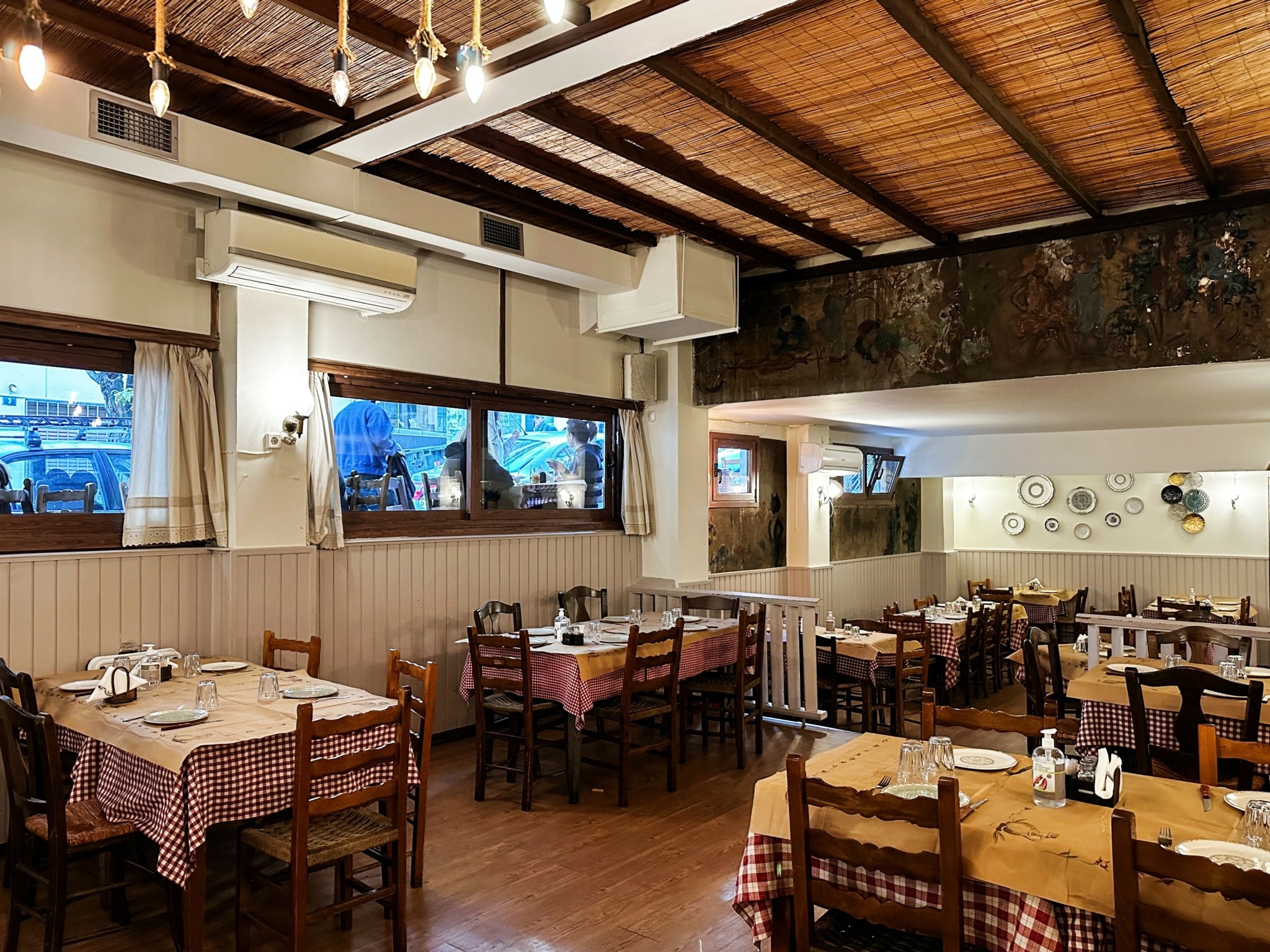 Ο εσωτερικός χώρος έχει την αύρα από μια Αθήνα παλιάς εποχής και φωτίζεται όμορφα από τα μικρά παράθυρα της πρόσοψης. Τους ζεστούς, δε, μήνες τα τραπεζάκια στο πεζοδρόμιο επιτρέπουν γεύμα υπό τους ήχους της πόλης. Το ευχάριστο σκηνικό ολοκληρώνουν αγαπημένα λαϊκά τραγούδια, σπιτική φιλοξενία και εξαίσιες νοστιμιές. «Βασιζόμαστε σε παραδοσιακές συνταγές και άριστα υλικά. Η ποιότητα της πρώτης ύλης είναι για εμάς αδιαπραγμάτευτη», τονίζει ο Γιάννης και φαίνεται πως γύρισαν όλη τη χώρα πριν καταλήξουν στα προϊόντα της κουζίνας τους. Τα αμνοερίφια, κυρίως αρνιά, προέρχονται από την Αμφιλοχία, την Παραμυθιά και τη Μυτιλήνη, τα μοσχαρίσια κρέατα από τις Σέρρες και την περιοχή του Ολύμπου, η φέτα από την Κεφαλονιά και τα Καλάβρυτα, η γαλομυζήθρα από την Κρήτη και το γαλοτύρι από τα Ζαγοροχώρια. Ενίοτε, στην ταβέρνα εμφανίζονται και κρέατα όπως η προβατίνα και ο μαύρος χοίρος, όταν βρίσκουν «καλή ποιότητα από έμπιστους παραγωγούς». Όλες οι κοπές και οι παρασκευές των φαγητών γίνονται στο μαγαζί.