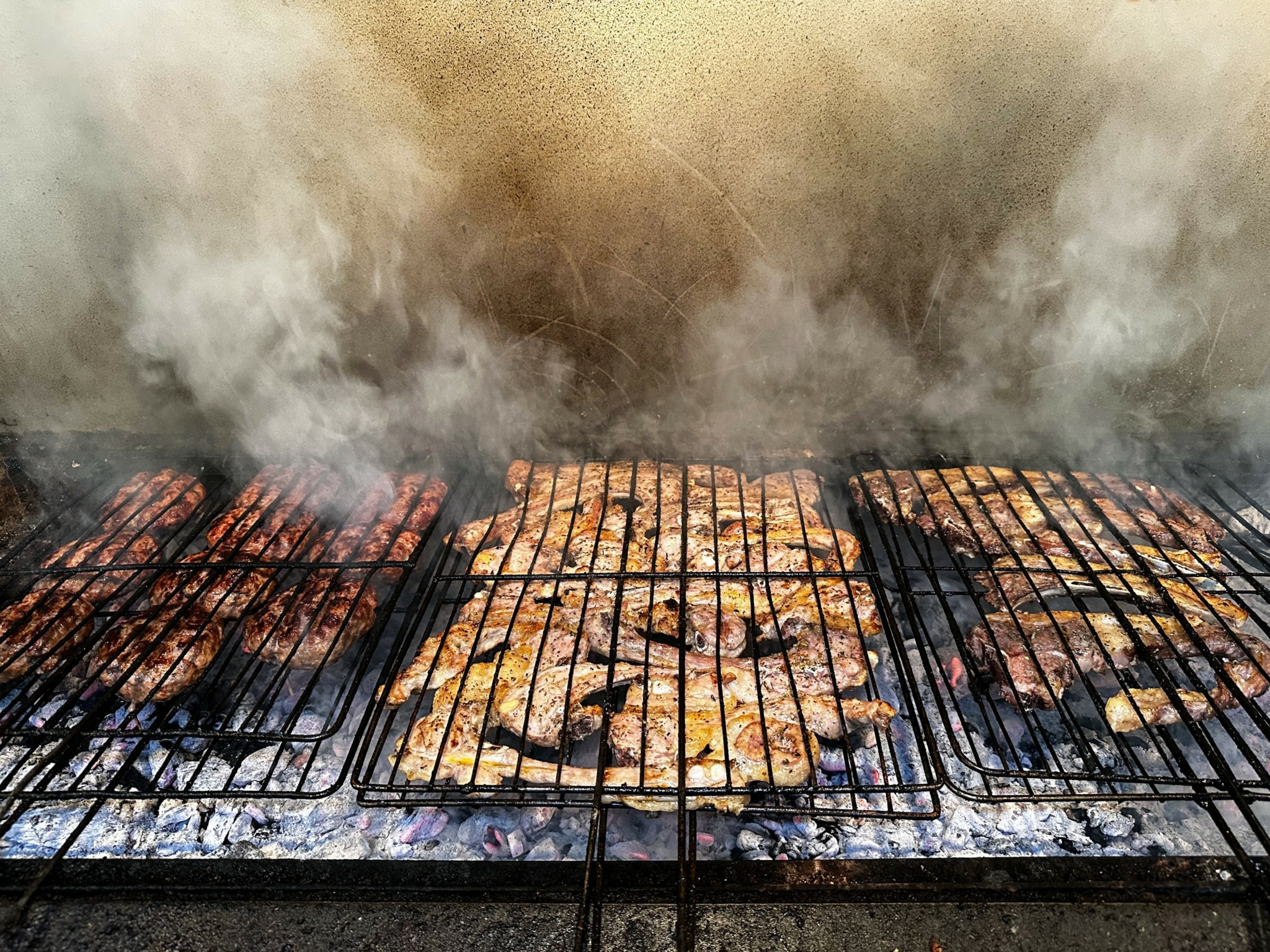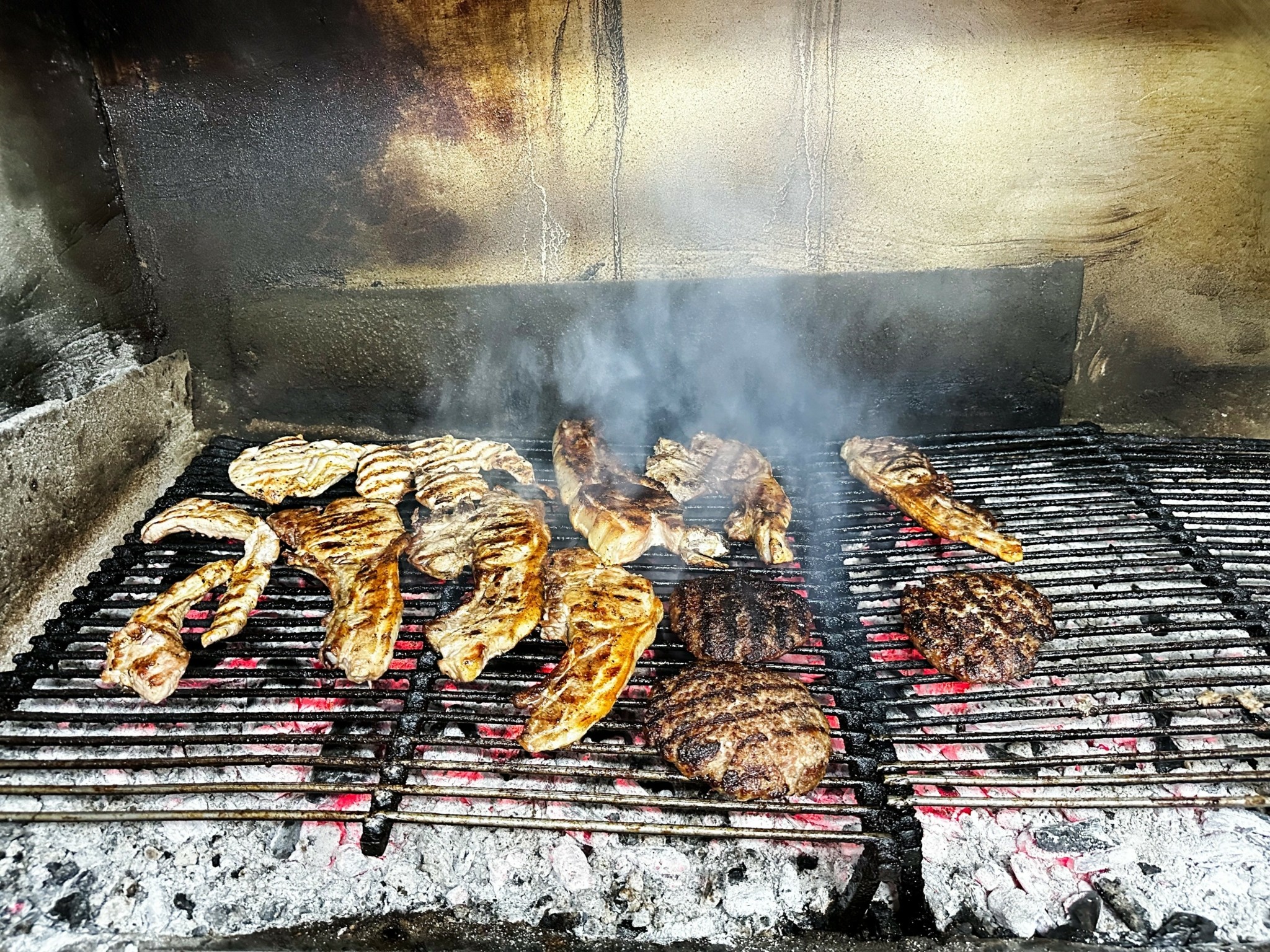 Το μενού έχει τα φώτα στραμμένα στα ψητά, αλλά από τις σελίδες του δε λείπουν σαλάτες και ορεκτικά, ανάμεσά τους θεσπέσια χόρτα εποχής, άψογα καθαρισμένα και βρασμένα με δεξιοτεχνία, παραδοσιακά τυροπιτάρια, τυροκαυτερή και απίθανη μελιτζανοσαλάτα –η καλύτερη ίσως που έχω δοκιμάσει ποτέ– με μελιτζάνα ψημένη στα κάρβουνα, κόκκινη πιπεριά Φλωρίνης και πράσινη κέρατο.