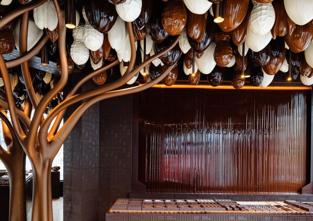 Πάνω από τα κεφάλια τους, φανταστικά «δέντρα» σμιλεμένα από σοκολάτα απλώνονται προς την οροφή, με κρεμαστούς καρπούς κακάο και «φρούτα» που μοιάζουν με στολίδια σ’ ένα ονειρικό δάσος. Οι πάγκοι θυμίζουν γιγάντια μπισκότα και οι τοίχοι είναι επενδυμένοι με πάνελ που παραπέμπουν σε τεράστιες σοκολάτες.