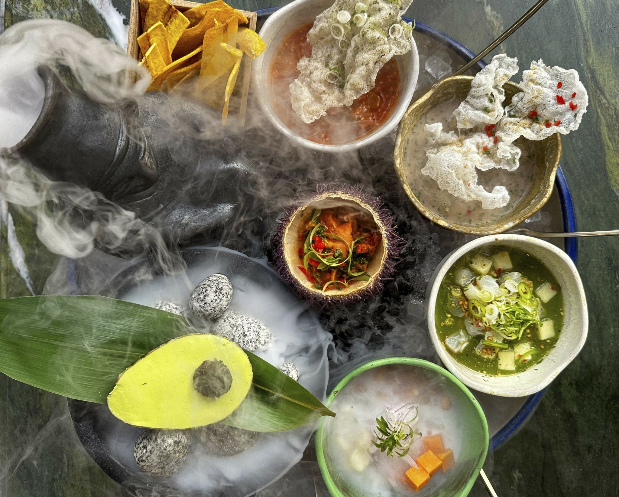 Η αυλαία του δικού μου δείπνου άνοιξε με μια εντυπωσιακή σύνθεση από ωμά πιάτα με ταρτάρ king crab, αβοκάντο και αυγά χελιδονόψαρου και πέντε καταπληκτικά σεβίτσε – lubina clásica με λαυράκι, καλαμπόκι, γλυκοπατάτα, κρεμμυδάκι και leche de tigre, corvina a la trufa με μυλοκόπι, ponzu, σχοινόπρασο και φρέσκια τρούφα, atún chifa με κιτρινόπτερο τόνο, σουσάμι, κράκερ ρυζιού και chili garlic, dorada nikkei με τσιπούρα, χυμό αγγουριού, λάιμ, μέντα και φαγόπυρο και erizos del mar με αχινό, νερό ντομάτας, ají roccoto και κόλιανδρο.