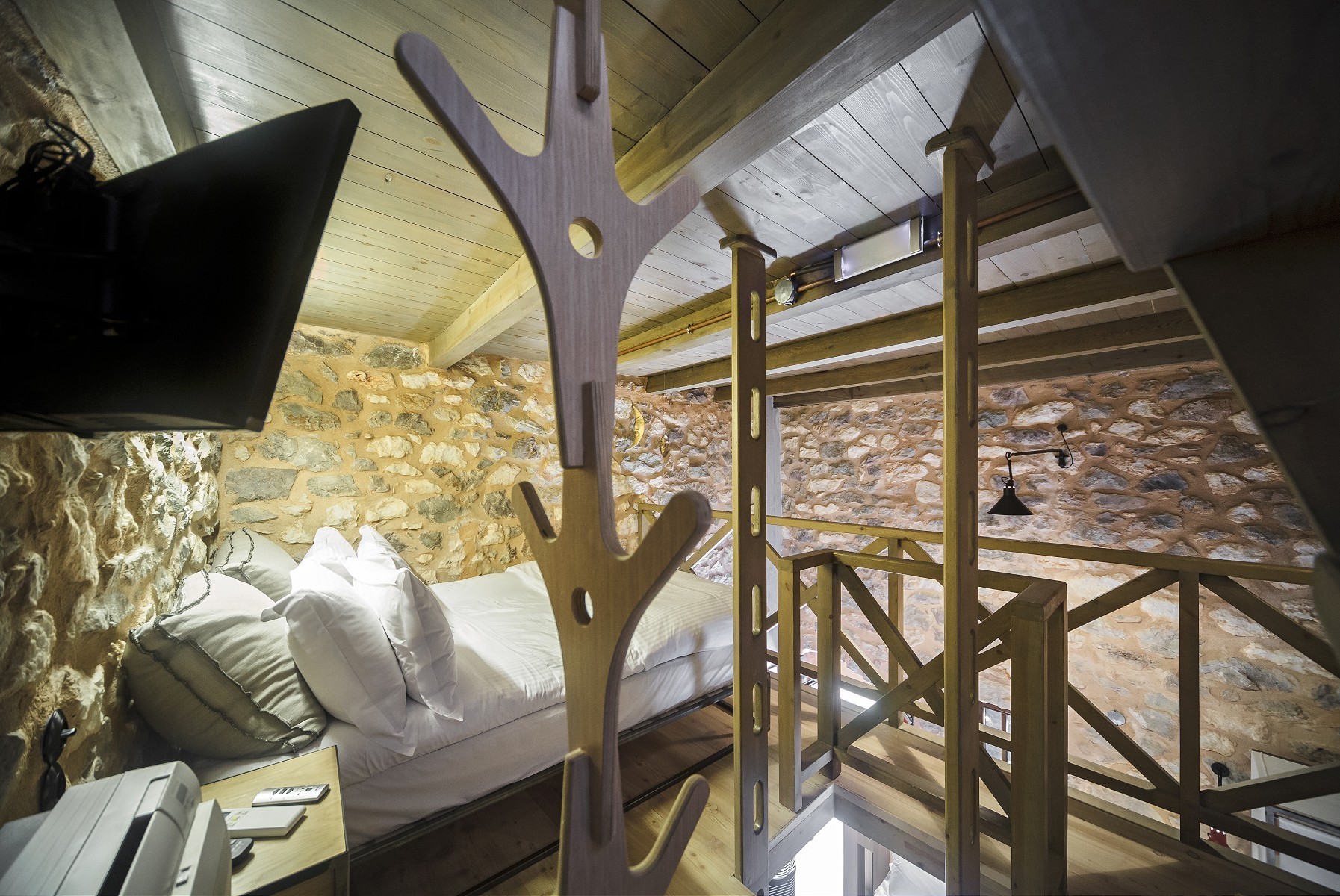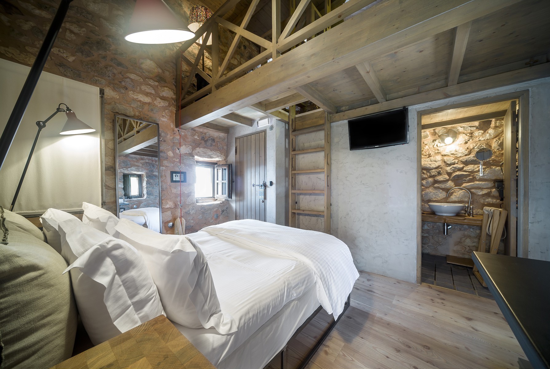 Η Master suite στα δύο ψηλότερα επίπεδα του πύργου που μετατράπηκε σε πρότυπο ξενώνα, εξασφαλίζουν την κορυφαία απόδραση πνευματικής ηρεμίας. Πέτρα και ξύλο με σεβασμό στην παραδοσιακή μανιάτικη αρχιτεκτονική και πουπουλένια λευκά είδη για σοβαρή ξεκούραση. Το πρώτο επίπεδο της σουίτας φιλοξενεί το κύριο υπνοδωμάτιο, ενώ το επάνω επίπεδο κρύβει έναν ακόμη παραμυθένιο χώρο διαμονής.