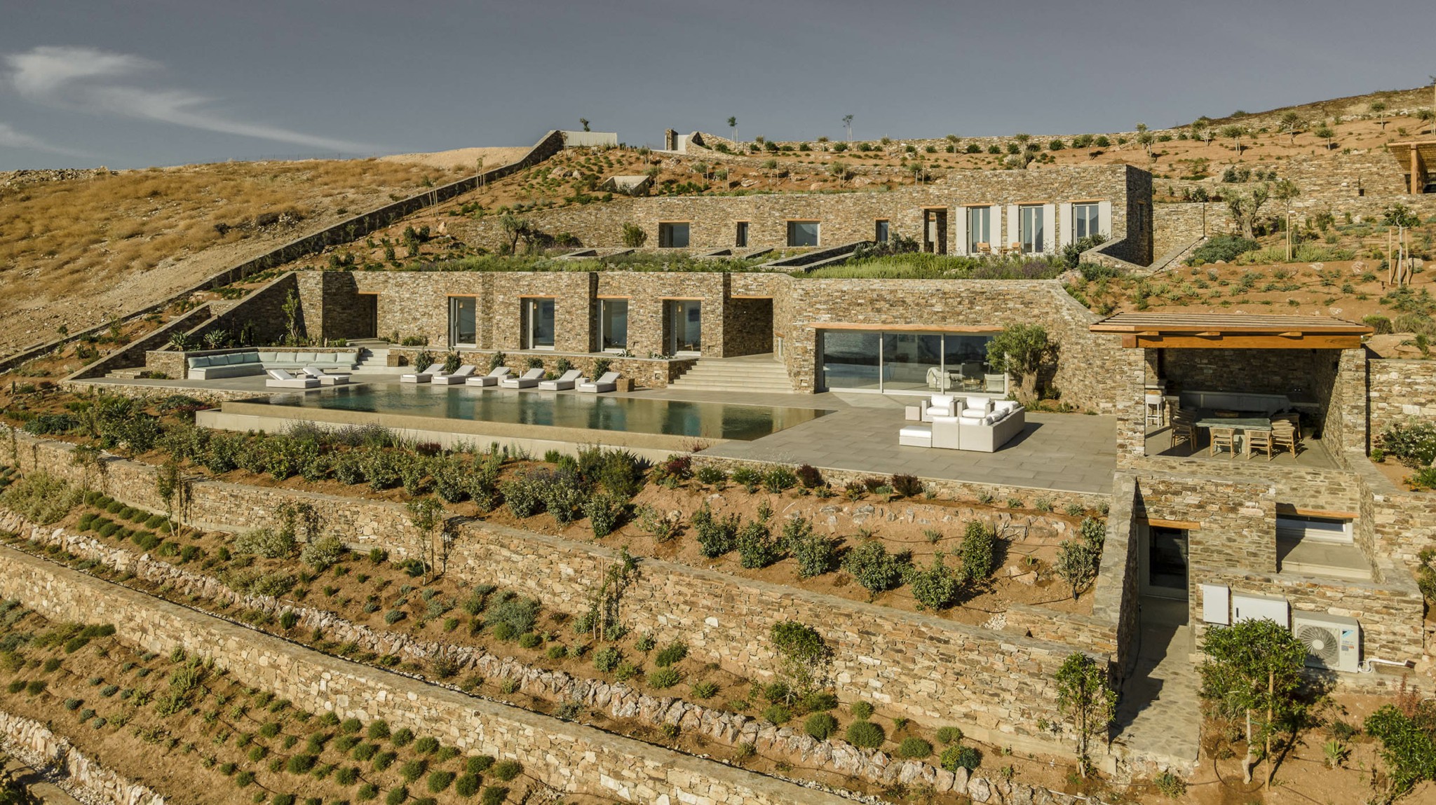 Το άλλο πρόβλημα ήταν η μόνωση. Θερμομόνωση και υγρομόνωση. Η οποία έπρεπε να ήταν πάρα πολύ ισχυρή. «Εκεί επιλέξαμε τη μέθοδο της πολυουρίας. Πολύ σημαντική ήταν η τελική πλήρωση της περιοχής με χώμα. Η μεγάλη κλίση του εδάφους αφού γέμισε με φυτικό χώμα παρουσίασε μεγάλη ευαισθησία στις έντονες βροχοπτώσεις όπου κυλούσε προς τα κάτω, προς το κτίριο επειδή δεν είχαν πιάσει οι ρίζες του. Με το πέρασμα του χρόνου, το πρόβλημα σταμάτησε. Ενα από τα μεγαλύτερα προβλήματα των σπιτιών στις Κυκλάδες είναι η διαχείριση του αέρα. Σε αυτήν την κατοικία υπάρχουν τουλάχιστον πέντε – έξι περιοχές που κατά τη διάρκεια του μελτεμιού μπορεί κάποιος να καθίσει ήρεμα. Ταυτόχρονα η κατοικία έχει τοποθετηθεί με τέτοιο τρόπο ώστε να έχει την καλύτερη δυνατή θέα προς τη χώρα της Αντιπάρου. Ειδικά το βράδυ το θέαμα είναι μαγευτικό. Και στο τέλος ήταν και  η διαχείριση της ιδιωτικότητας. Μιλάμε για σπίτια που είναι μεγάλα, έχουν πολλούς ξενώνες και ένας πολύ σημαντικός παράγοντας είναι ο σχεδιασμός με τις τεθλασμένες γραμμές που εξασφαλίζει την ιδιωτικότητα του κάθε καλεσμένου».