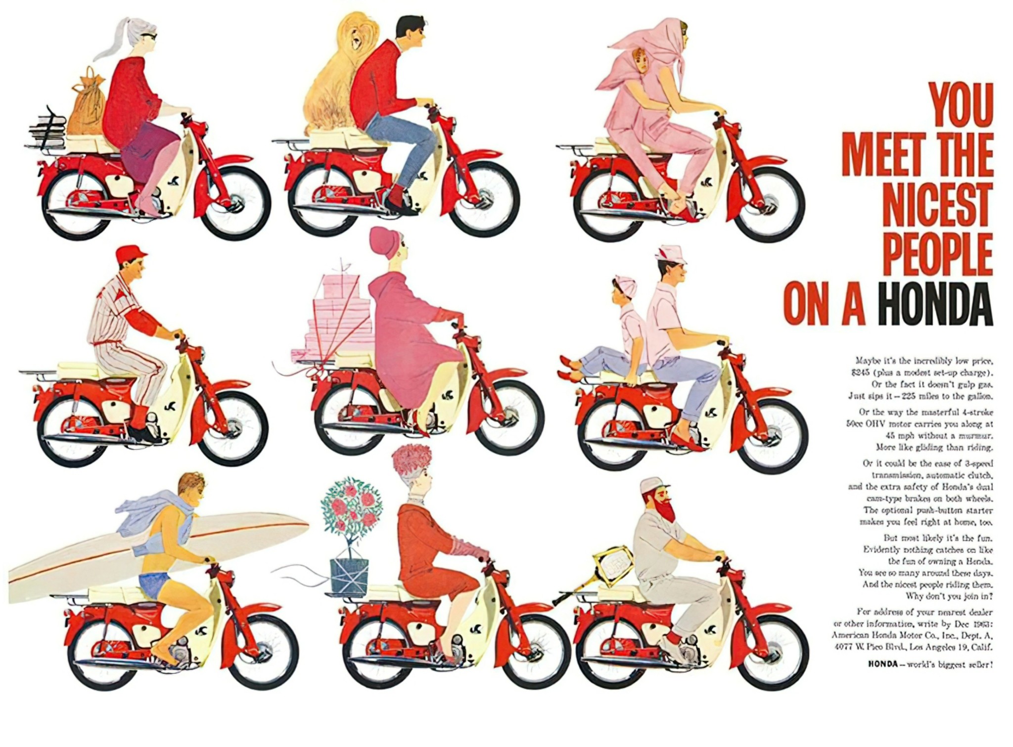 Τα σλόγκαν: «You Meet the Nicest People on a Honda» και «The Nicest Things Happen on a Honda» έμειναν στην ιστορία. Και διδάσκονται ακόμα και σήμερα ως πρακτικές μάρκετινγκ και διαφήμισης που αλλάζουν τη μοίρα μιας ολόκληρης εταιρείας. Μέσα από τα περιοδικά Life, Time και Saturday Evening Post, η εικόνα της μοτοσυκλέτας αλλάζει. Ο μέσος Αμερικανός ταυτίζεται. Οι πωλήσεις εκτοξεύονται σε πάνω από 40.000 μονάδες ετησίως. Η pop κουλτούρα αποθεώνει το Super Cub: οι Beach Boys τραγουδούν το «Little Honda» και το περιοδικό Life του κάνει μεγάλο αφιέρωμα. H Αμερική είχε κατακτηθεί, έμενε ο υπόλοιπος κόσμος.