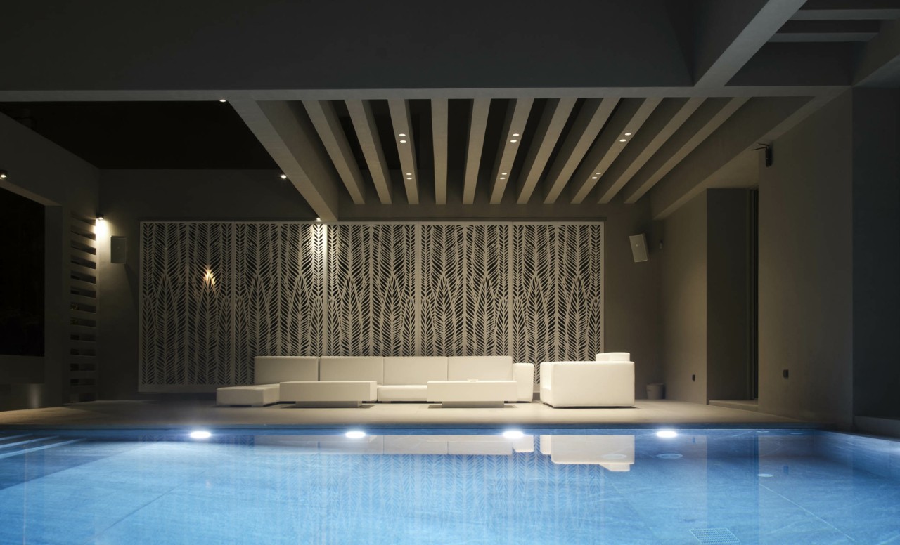 Ο εξωτερικός χώρος έχει σχεδιαστεί με τέτοιο τρόπο, ώστε να προσφέρει μικρές καθημερινές αποδράσεις από τη ζωή της πόλης. Η πισίνα των 53 τ.μ. καταλαμβάνει το μπροστινό μέρος της κατοικίας και είναι επενδεδυμένη με μάρμαρο Αλιβερίου. Τον υπαίθριο χώρο καλύπτει μια πέργκολα 58 τ.μ. που προσφέρει σκίαση, ενώ επάλληλα μεταλλικά διάτρητα φύλλα δημιουργούν ένα προστατευτικό παραπέτασμα από τις γειτονικές κατοικίες. Με τη χρήση του κατάλληλου φωτισμού, επιτυχγάνεται η διακριτική σηματοδότηση των κινήσεων προς την κυρία είσοδο της κατοικίας.