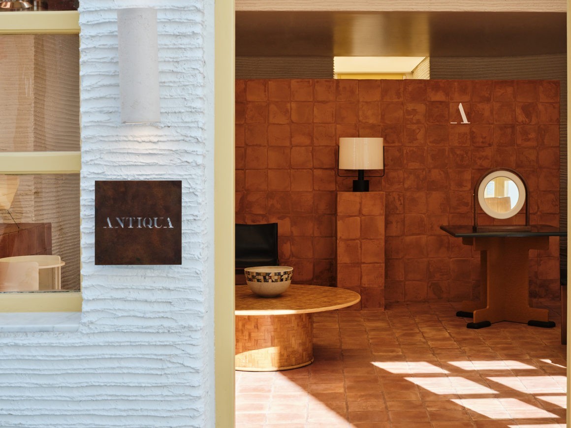 Ηδη από τα μισά του έργου αποφασίστηκε ποια θα ήταν η πρώτη έκθεση. Παρουσιάζεται σε συνεργασία με τη γκαλερί Antiqua των Αθηνών, η οποία ειδικεύεται σε έπιπλα και διακοσμητικά των μέσων του 20ου αιώνα. Οι ίδιοι οι σχεδιαστές της γκαλερί επέλεξαν μια προς μια τις αντίκες που εκτίθενται -από ένα vintage ψυγείο και άλλα ελληνικά αντικείμενα, μέχρι Ισπανικά σκαμπό από καρυδιά του 1960 και γερμανικές λάμπες από τα ‘70s. Μεταξύ των δημιουργών τους είναι οι Ettore Sottsass, Gaetano Pesce, Tito Agnoli και Afra e Tobia Scarpa. Κάθε δημιουργία «συνομιλεί» αυτό το καλοκαίρι με τον λιτό Κυκλαδικό χώρο και επαναπροσδιορίζουν η μια τον άλλο με νέους τρόπους.