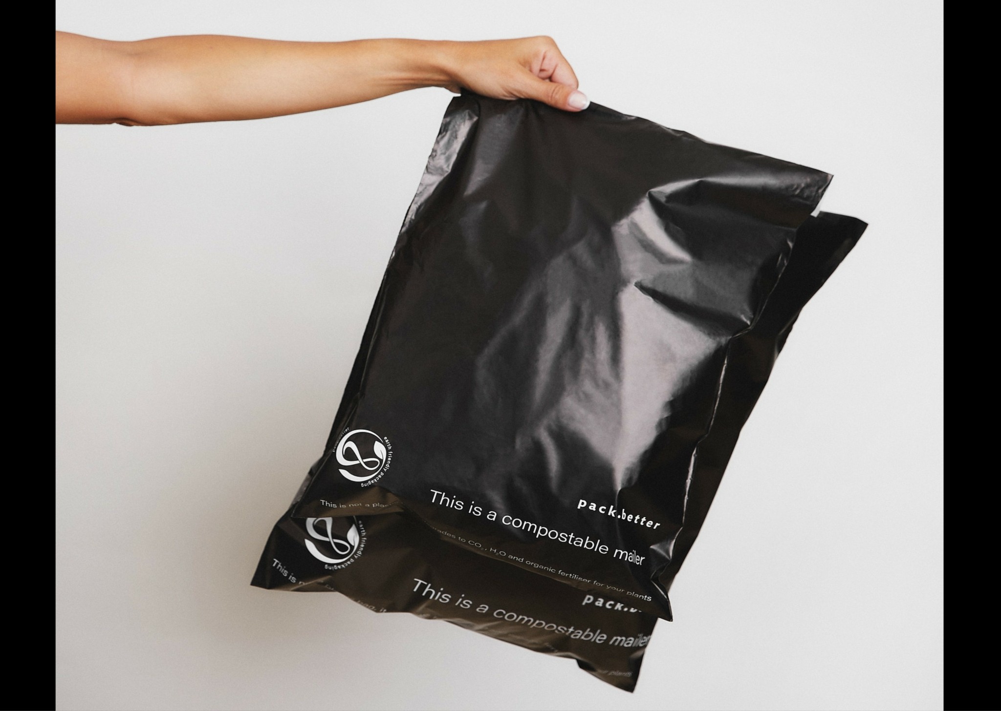 -Οι πλήρως βιοδιασπώμενες και κομποστοποιήσιμες σακούλες αποστολής Compostable Courier Bag: Κομψή, με ματ μαύρο φινίρισμα, ανθεκτική και αδιάβροχη, με αρνητικό αποτύπωμα άνθρακα, η σακούλα είναι κατασκευασμένη από φυσικό άμυλο φυτών χωρίς τοξικές ουσίες. Συνοδεύεται, μάλιστα, από την πιστοποίηση OK-Compost Industrial και μπορεί να διασπαστεί σε περίπου 180 ημέρες -να υπενθυμίσουμε ότι μία πλαστική σακούλα παραμένει στη φύση έως και 20 χρόνια.