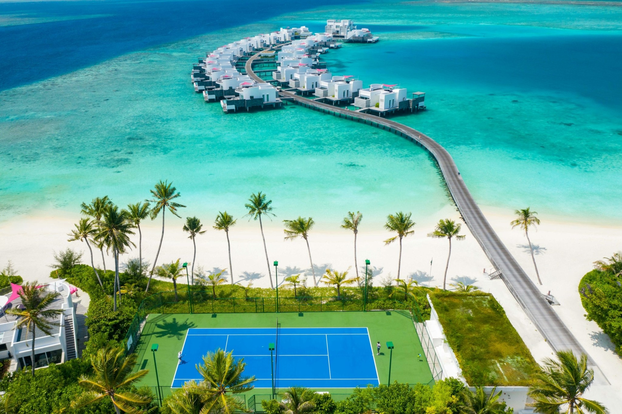 Με φόντο τους ψηλόλιγνους φοίνικες και τα τιρκουάζ νερά του νησιού Olhahali -ενός μικροσκοπικού τροπικού παραδείσου μόλις 15 λεπτά με υδροπλάνο από το Μale- το γήπεδο του ξενοδοχείου Jumeirah Maldives Olhahali Island προσφέρει τένις σε εξωτικό σκηνικό.