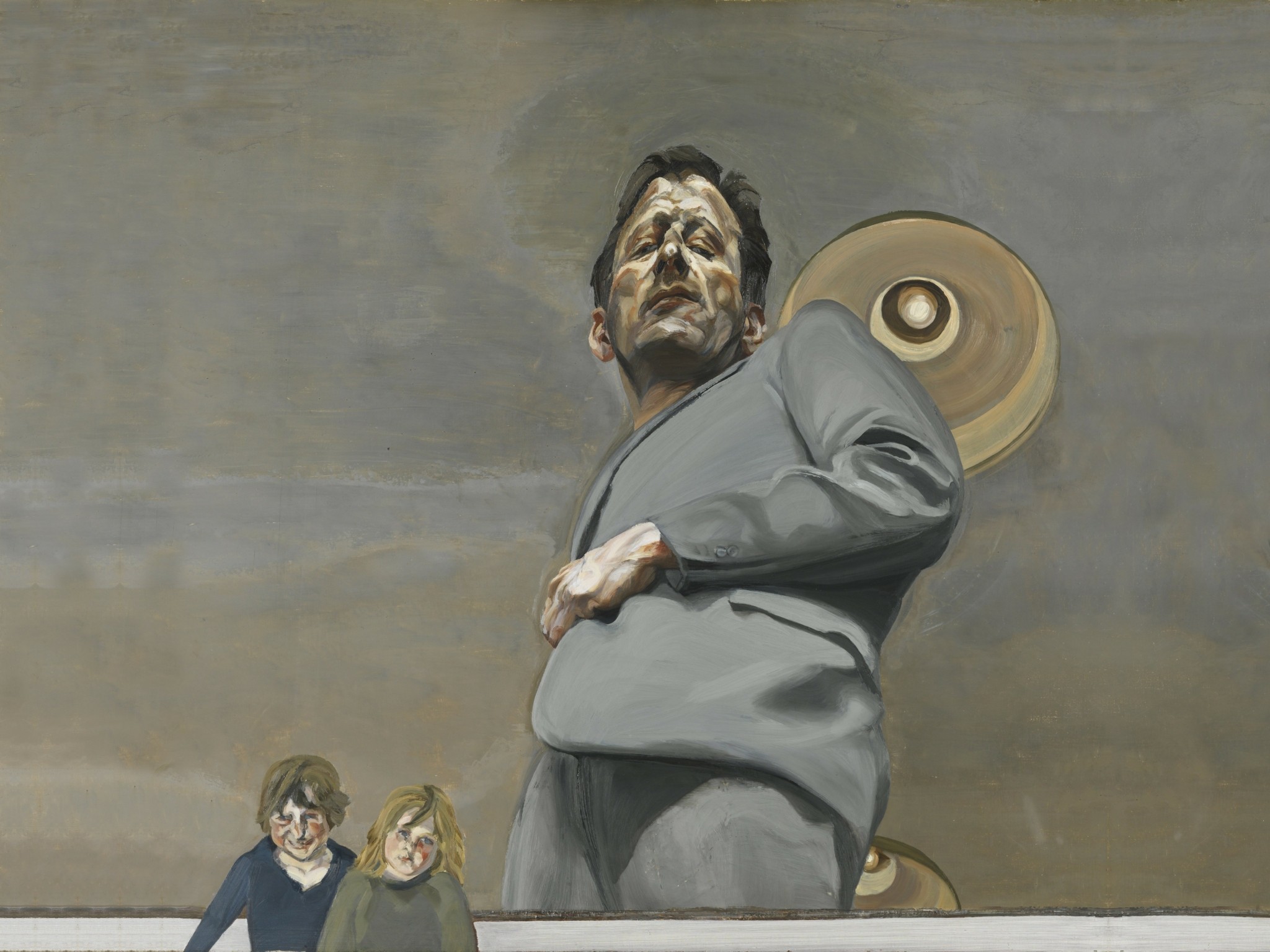 Η έκθεση “Bruce Bernard: Portraits of Friends” που τρέχει παράλληλα στην Gagosian, περιλαμβάνει μια επιλογή από φωτογραφίες του συγγραφέα και φωτογράφου που υπήρξε στενός φίλος των τεσσάρων ζωγράφων. Ανεπίσημες, οικείες και αυθόρμητες, οι εικόνες αποτυπώνουν χαλαρές, αστείες στιγμές από το στούντιο του Freud, όπως το πορτρέτο “Lucian Freud Posing as a Henry Moore” (1983), όπου o ζωγράφος ποζάρει σε μια στάση που θυμίζει χορευτή μπαλέτου. Η πιο διάσημη από τις φωτογραφίες του Bernard είναι εκείνη όπου ο Freud αγγίζει παιχνιδιάρικα τα μαλλιά της ζωγράφου και ερωμένης του Celia Paul, υπό το βλέμμα της κόρης του Bella, αλλά κι εκείνη που κάνει κατακόρυφο, στηριζόμενος στο κεφάλι του, δίπλα στην Bella – ο Bernard θυμάται ότι σε αυτή τη φωτογραφία ο ζωγράφος επέμενε να συμπεριληφθεί στο κάδρο η μύτη των παπουτσιών του.