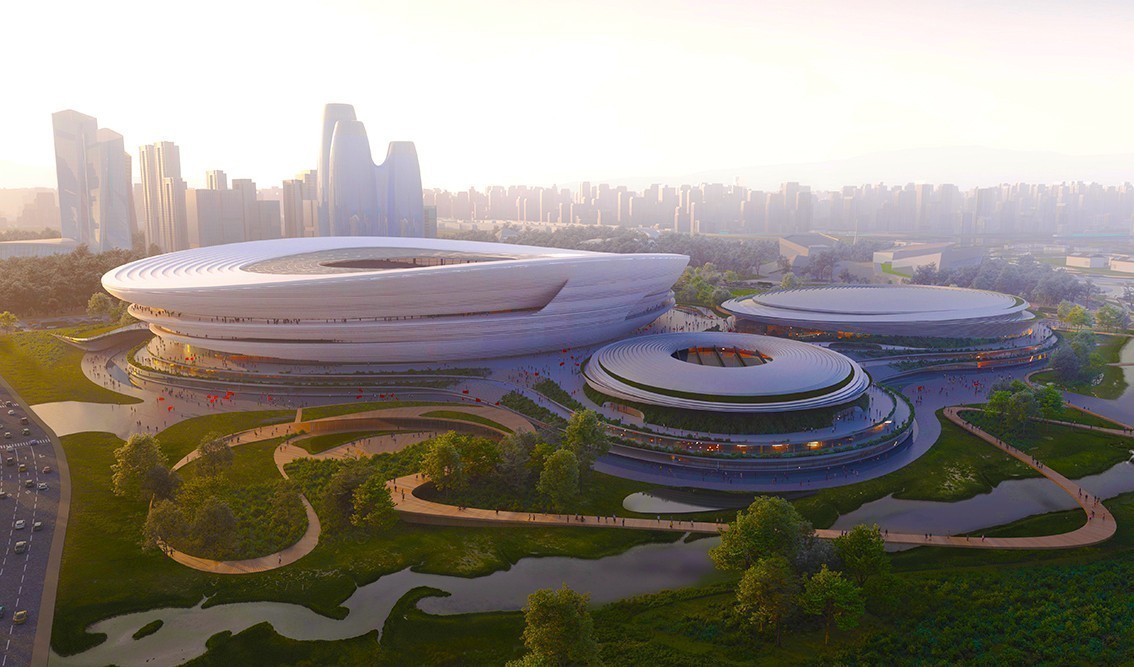 Άλλο ένα κολοσσιαίο έργο με την υπογραφή του στούντιο της θρυλικής αρχιτέκτονα που έμεινε στην ιστορία για τα φουτουριστικά, ρευστά σχέδιά της. Πρόκειται για ένα υπερσύγχρονο συγκρότημα αθλητικών εγκαταστάσεων που περιλαμβάνει ποδοσφαιρικό γήπεδο 60.000 θέσεων, κλειστή αρένα 19.000 θέσεων για μπάσκετ και συναυλίες, καθώς και κέντρο υγρού στίβου με δύο πισίνες 50 μέτρων. Οι αρχιτέκτονες εμπνεύστηκαν από τις κλιμακωτές φυτείες τσαγιού της περιοχής του Hangzhou και σχεδίασαν ένα εμβληματικό στάδιο, με τις κερκίδες να σχηματίζουν κυματισμούς στην πρόσοψη, η οποία θα επενδυθεί με περσίδες, προσδίδοντας ημιδιαφάνεια και σκίαση στο γήπεδο.