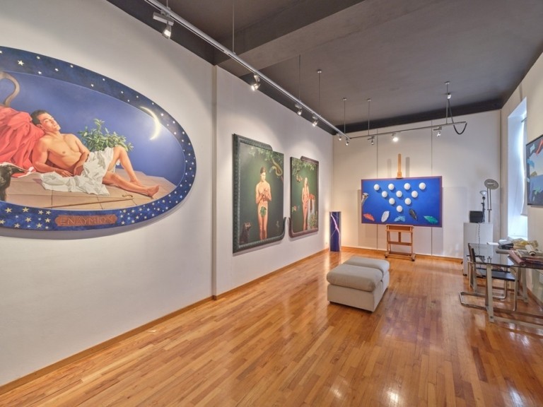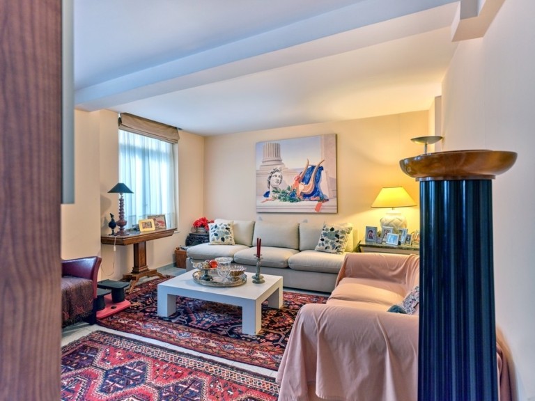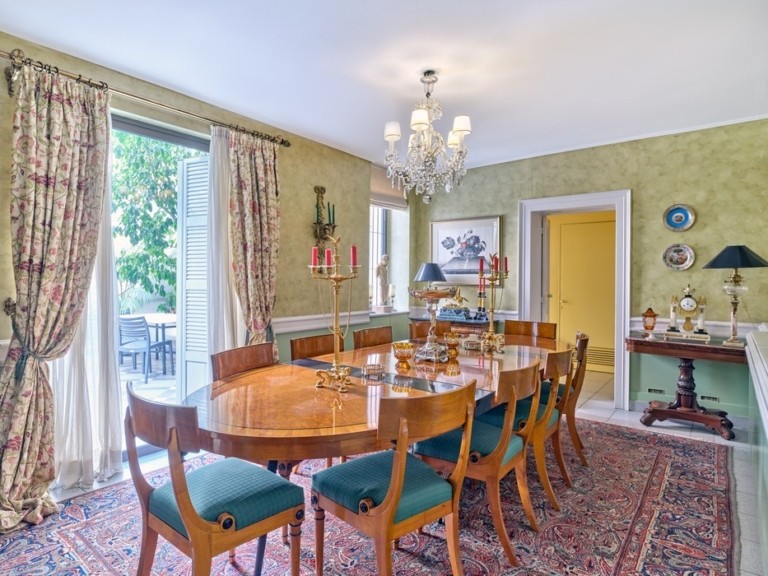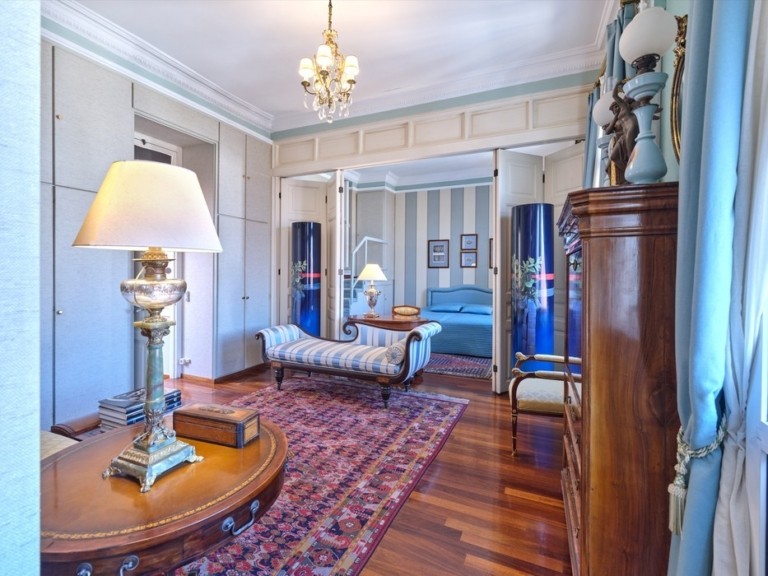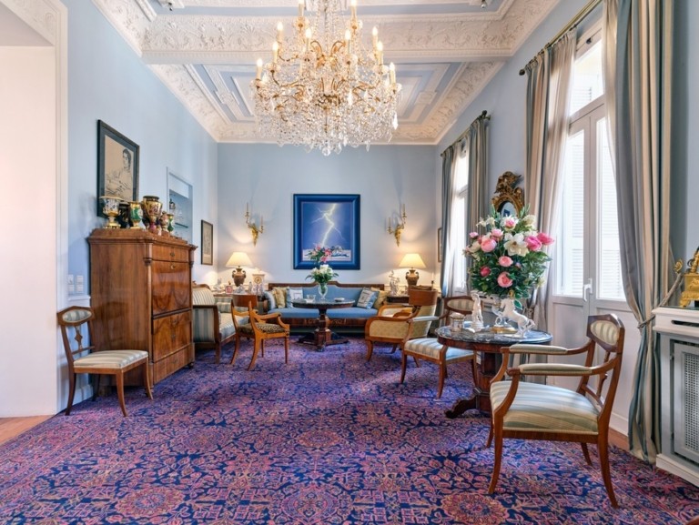 Στο εσωτερικό, το βλέμμα κερδίζει ένα κομψό σαλόνι με τις περίτεχνες οροφές, τα ωραία δρύινα δάπεδα και τα καταπληκτικά έργα τέχνης. Για να αγαπήσεις το σπίτι αυτό αρκεί να αγαπάς την Ελλάδα, την ιστορία και την τέχνη.