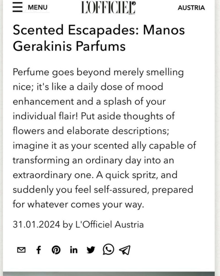 Το 2022 υπήρξε μια εξαιρετικά σημαντική χρονιά για την εταιρεία Manos Gerakinis Parfums, καθώς και για τον Έλληνα δημιουργό της. Η εταιρεία διακρίθηκε ανάμεσα στις Top 5 εταιρείες του 2021 στην τελική λίστα του Perfumeν Extraordinaire 2021, των βραβείων που αποκαλούνται τα “Όσκαρ” της αρωματοποιίας και απονέμονται από τον Fragrance Foundation UK. Ο συγκεκριμένος μη κερδοσκοπικός οργανισμός, με υψηλό κύρος στον κλάδο, συγκεντρώνει περισσότερες από 150 εταιρείες-μέλη στη Μεγάλη Βρετανία, περιλαμβάνοντας κορυφαίους κατασκευαστές, εταιρείες marketing και εκπροσώπους του λιανεμπορίου.