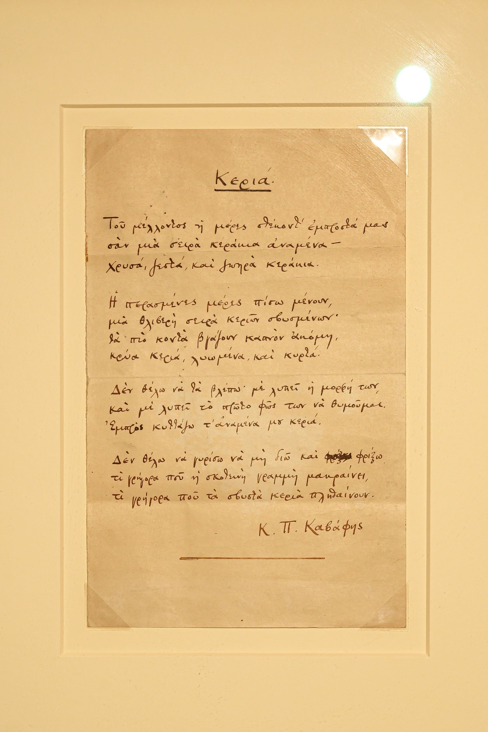 Η Χρύσα, ένα ιδιόχειρο ποίημα του Καβάφη και το έργο του Γιάννη Τσαρούχη προσελκύουν τα βλέμματα.