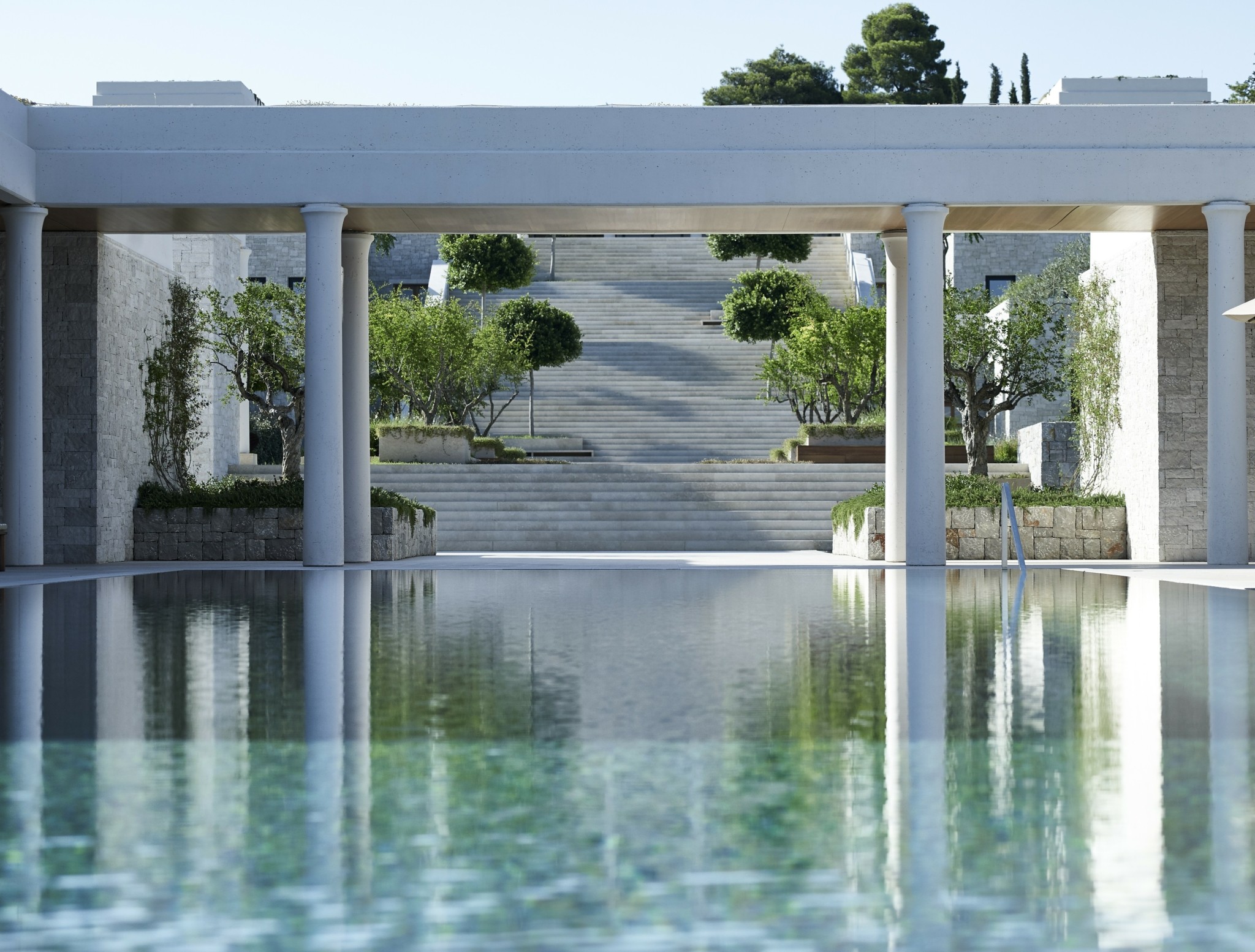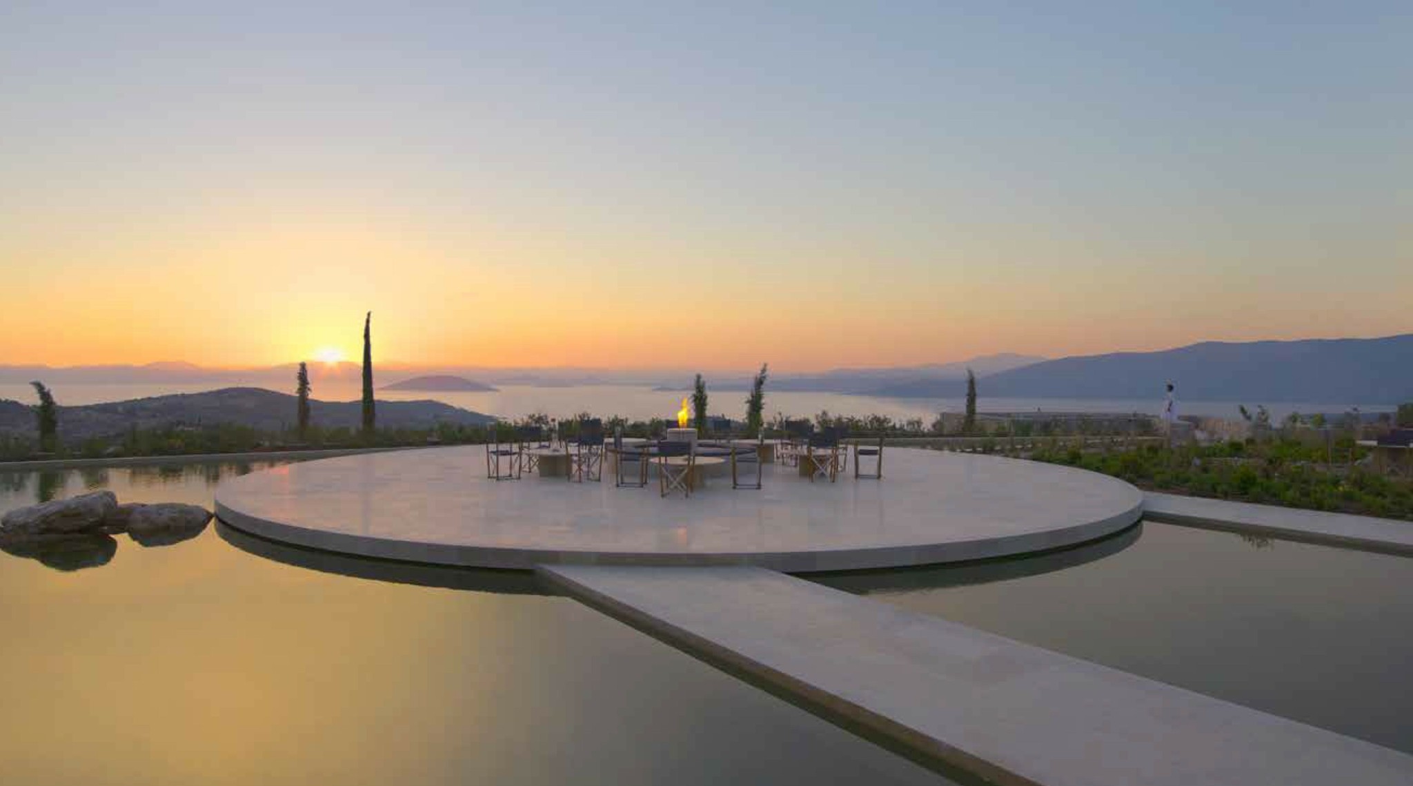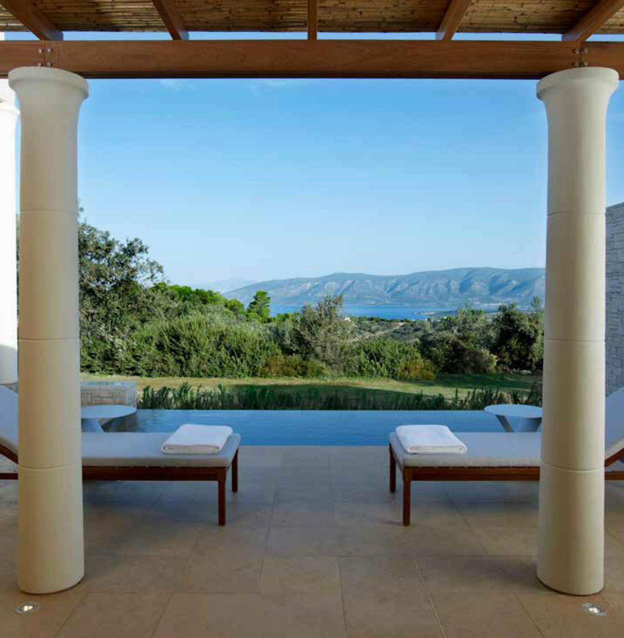 Σχεδιασμένη σαν μια σύγχρονη Ακρόπολη- όπως και το υπόλοιπο πολυτελές Amanzoe -από τους αρχιτέκτονες Edward Tuttle και Μάριο Αγγελόπουλο, αγκαλιάζει την αρχιτεκτονική και την ψυχή της αρχαίας Ελλάδας. Υψηλή αισθητική, ιδιωτικότητα και γαλήνη.
